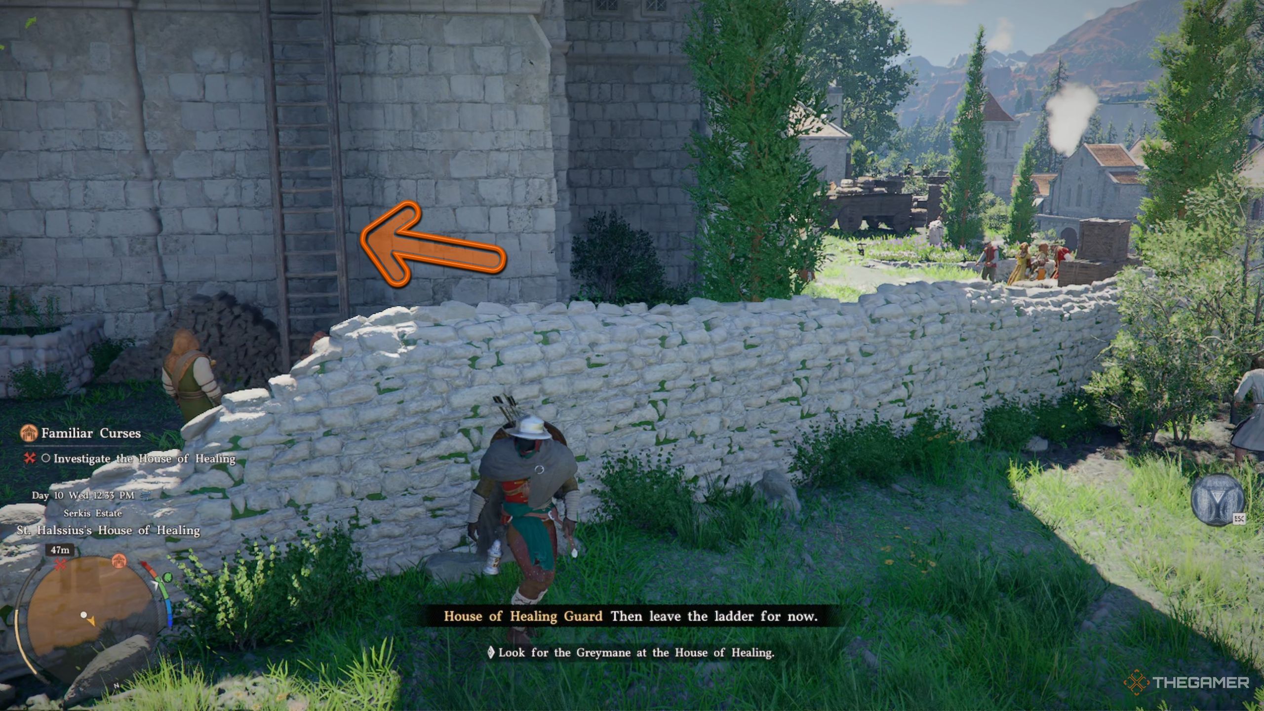 Чтобы попасть в церковь на восточной стороне города Эрнан, требуется либо костюм, либо пропуск, и каждый стоит 10 серебряных монет – значительная сумма в начале игры. К счастью, нет необходимости тратить эти деньги, так как есть альтернативный способ добраться до Дома Исцеления без разрешения. Просто направляйтесь влево от главного входа и поднимитесь на холм к большому зданию.