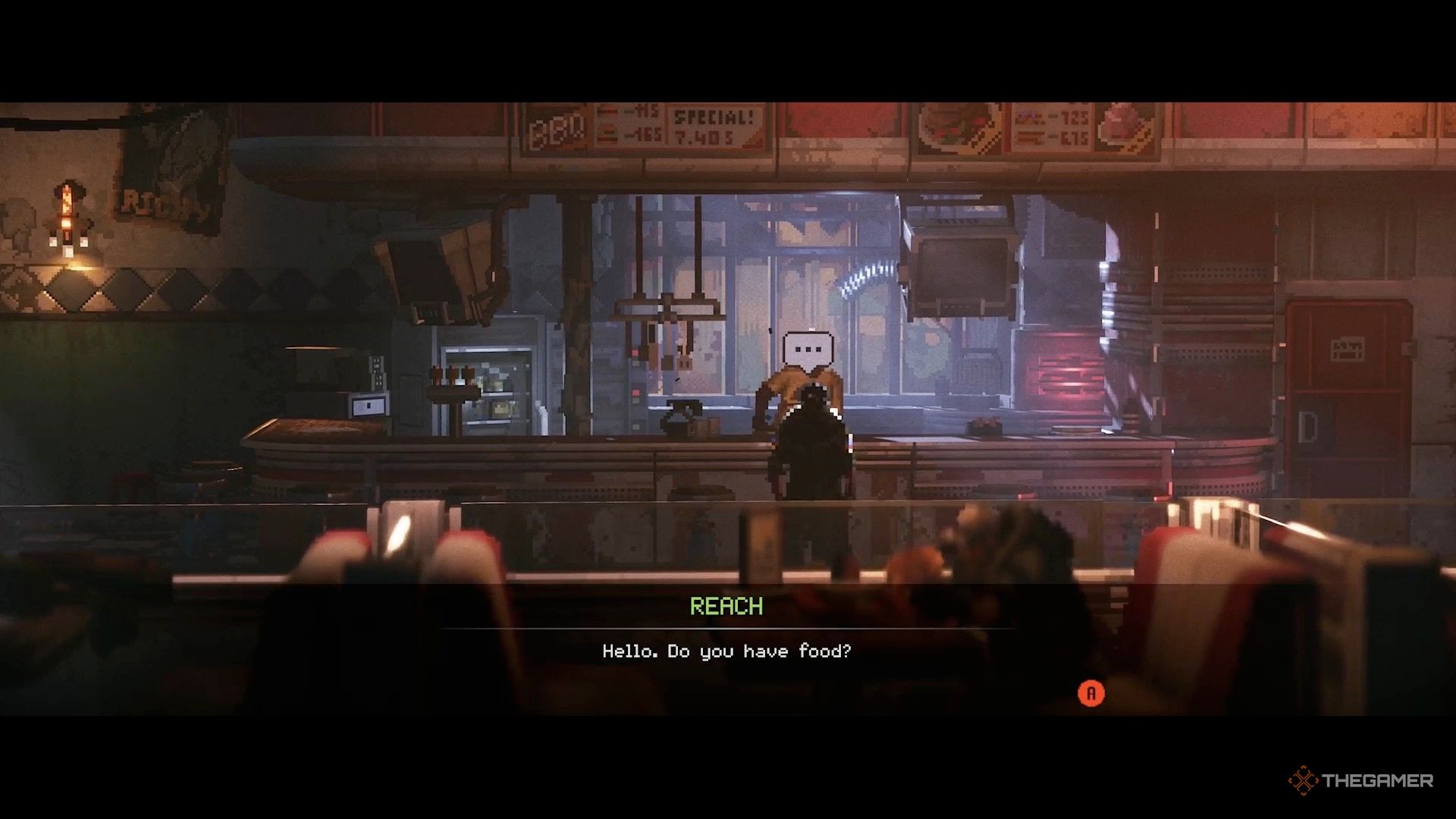 Чтобы поесть, вернитесь на станцию. Оказавшись внутри, поверните направо и поднимитесь по лестнице с большой надписью ‘Food’. Вы найдете ее в той же области, где встретили Совет в Главе Второй.