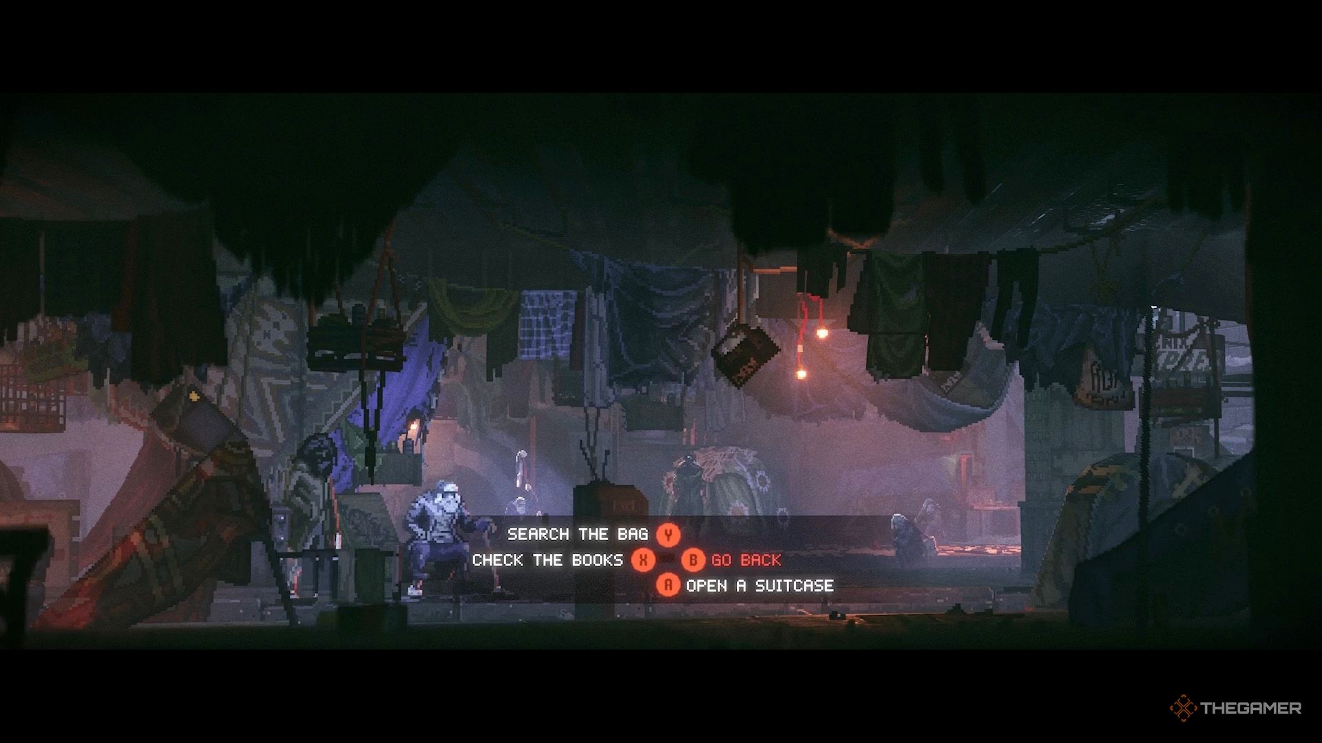 Чтобы найти код, выберите ‘Осмотреть’. Затем вы можете обыскать сумку, проверить книги или открыть чемодан.