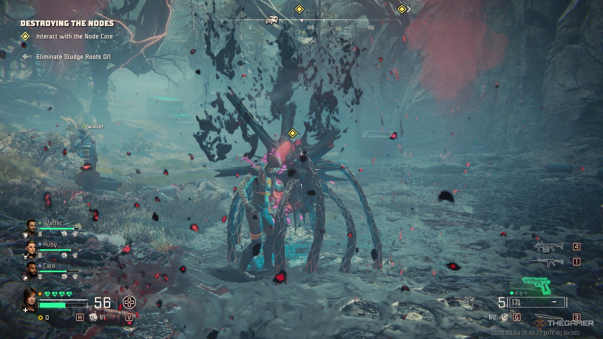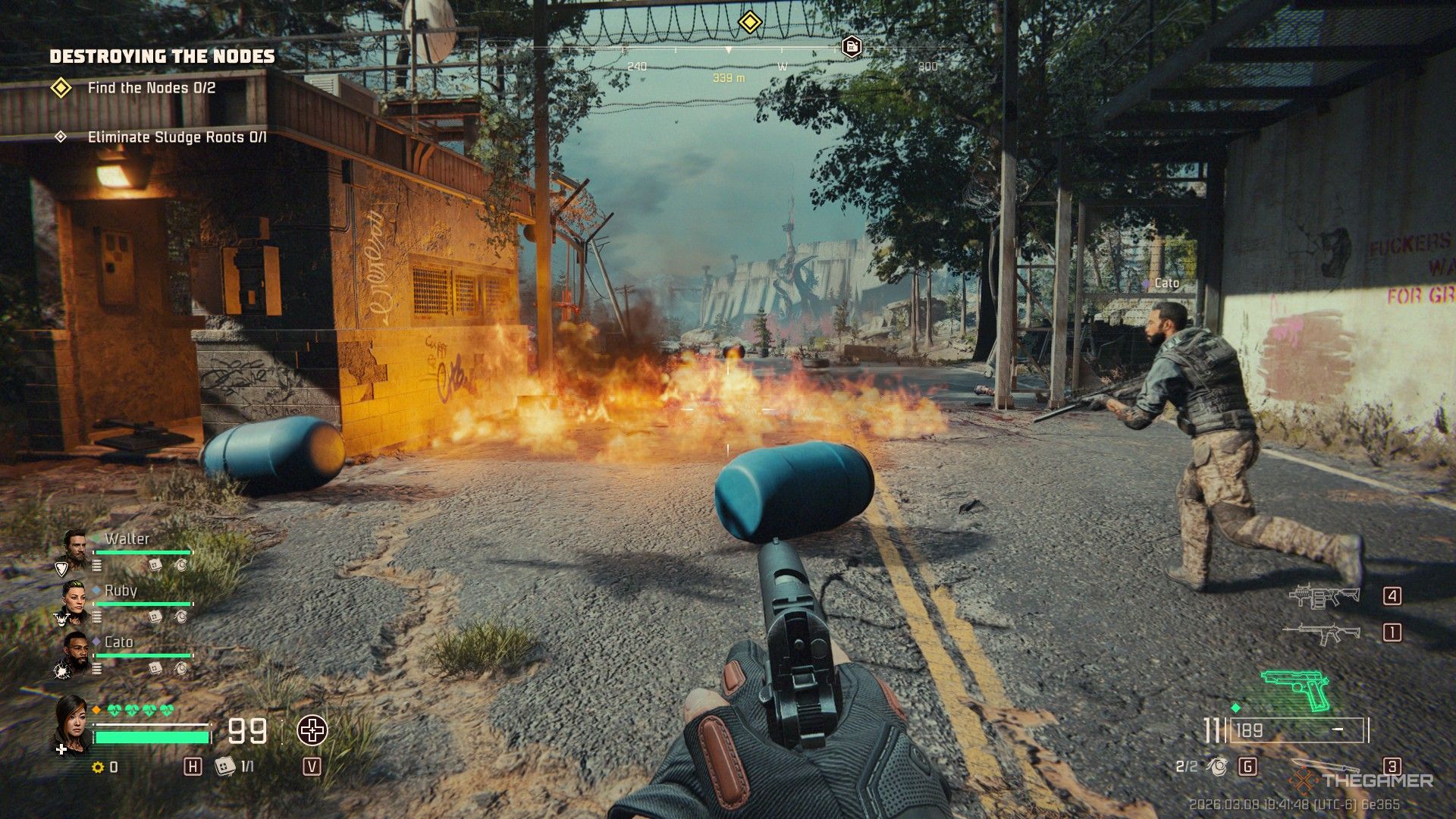 Ваша следующая цель — найти и уничтожить еще один узел. Двигайтесь к указателю цели на вашем экране. Будьте готовы отбиваться от нескольких групп зомби по мере продвижения вперед. Лучше всего поддерживать некоторую дистанцию и избегать окружения врагами.