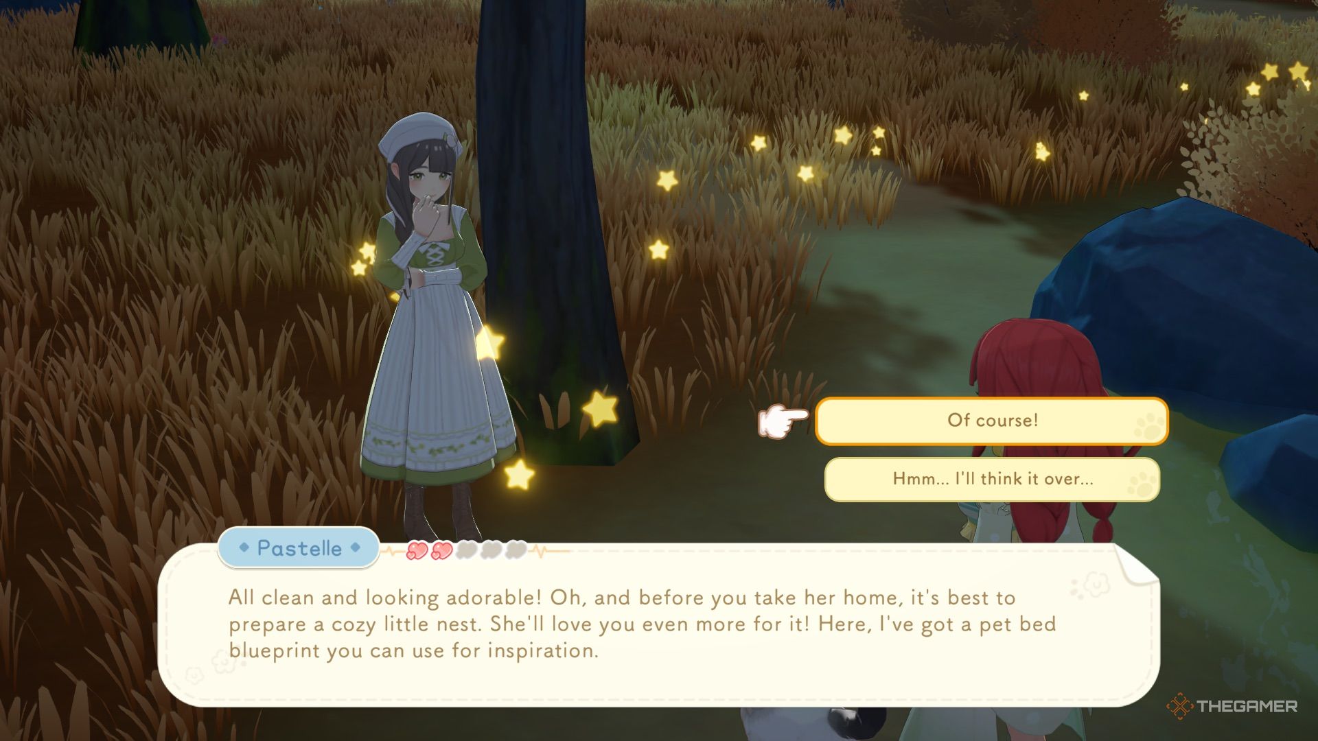 Этот питомец будет готов к усыновлению сразу, так что вам не придется тратить время на повышение его привязанности. Вы также можете усыновлять питомцев напрямую у Stella. Это те же питомцы, которых вы видите по всему острову, но усыновление таким способом стоит много монет – тысячи, на самом деле.