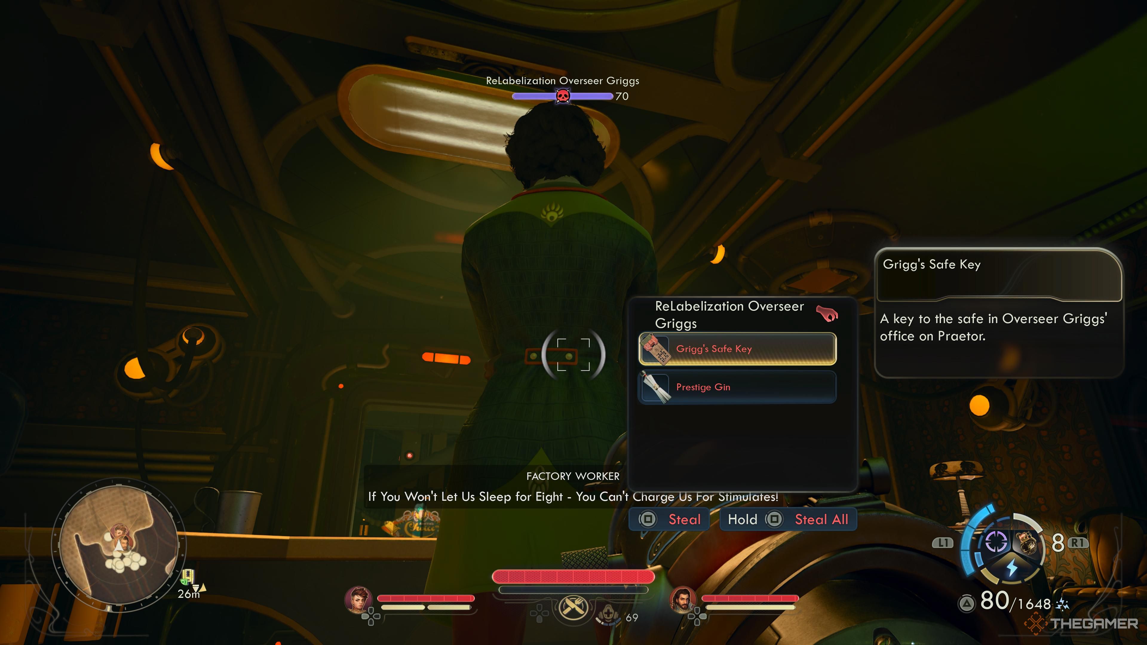 После напряжённого обмена репликами с Григгс, который подчеркнул её высокомерие, ваша следующая цель – провести переговоры с бастующими рабочими и попытаться достичь компромисса, чтобы убедить их вернуться к работе. Вы найдёте их возле бокового входа на фабрику, на верхней части погрузочных платформ. Вы также заметите много людей в униформе Spacer’s Choice – кое-что, о чём следует помнить.