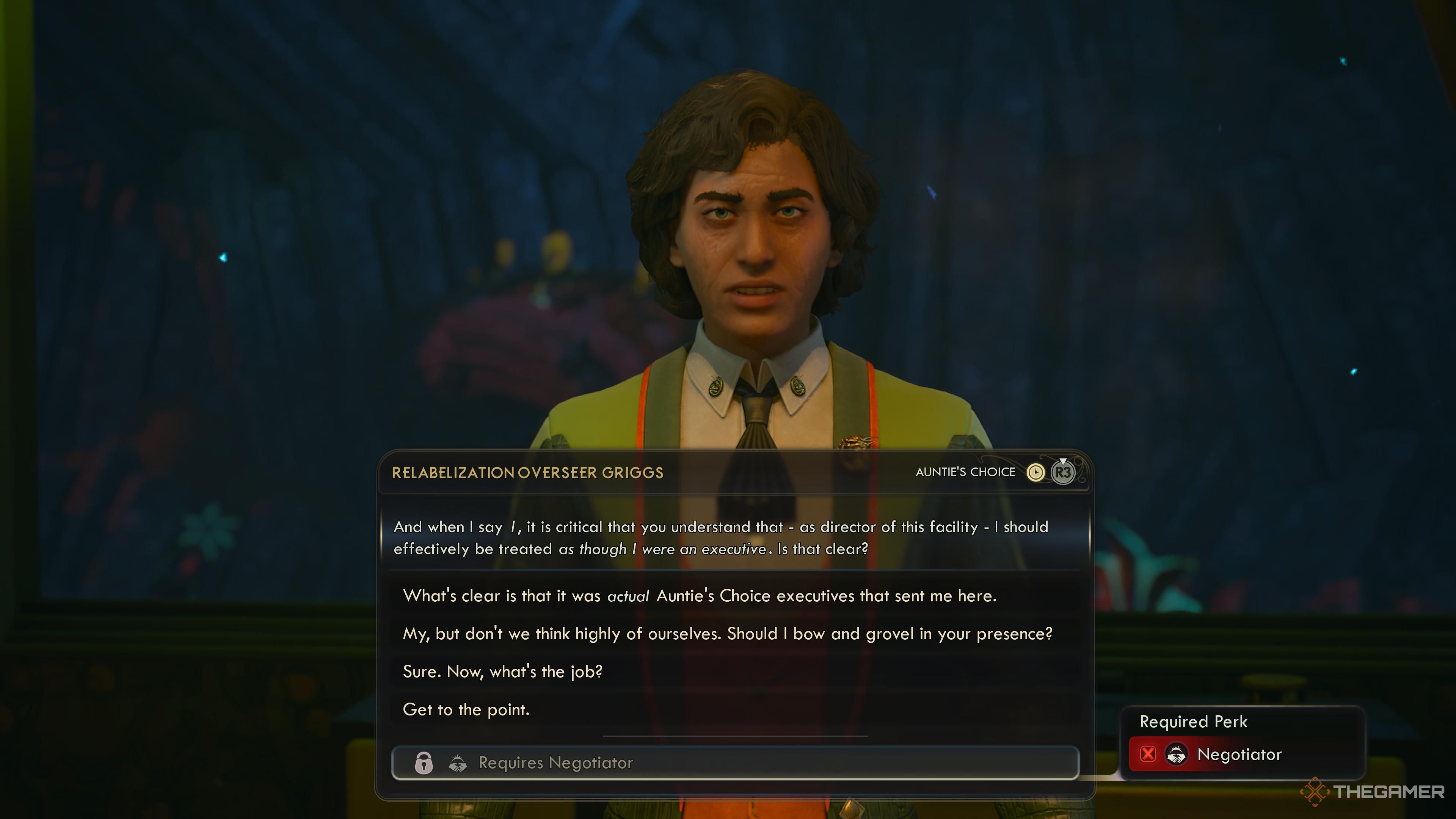 Мы находимся на последнем этапе переговоров. Этот этап более ограничен, и Григгс твердо стоит на одном пункте – он не уступит, если вы не продемонстрируете определенные вещи во время разговора. Вот ваши варианты: