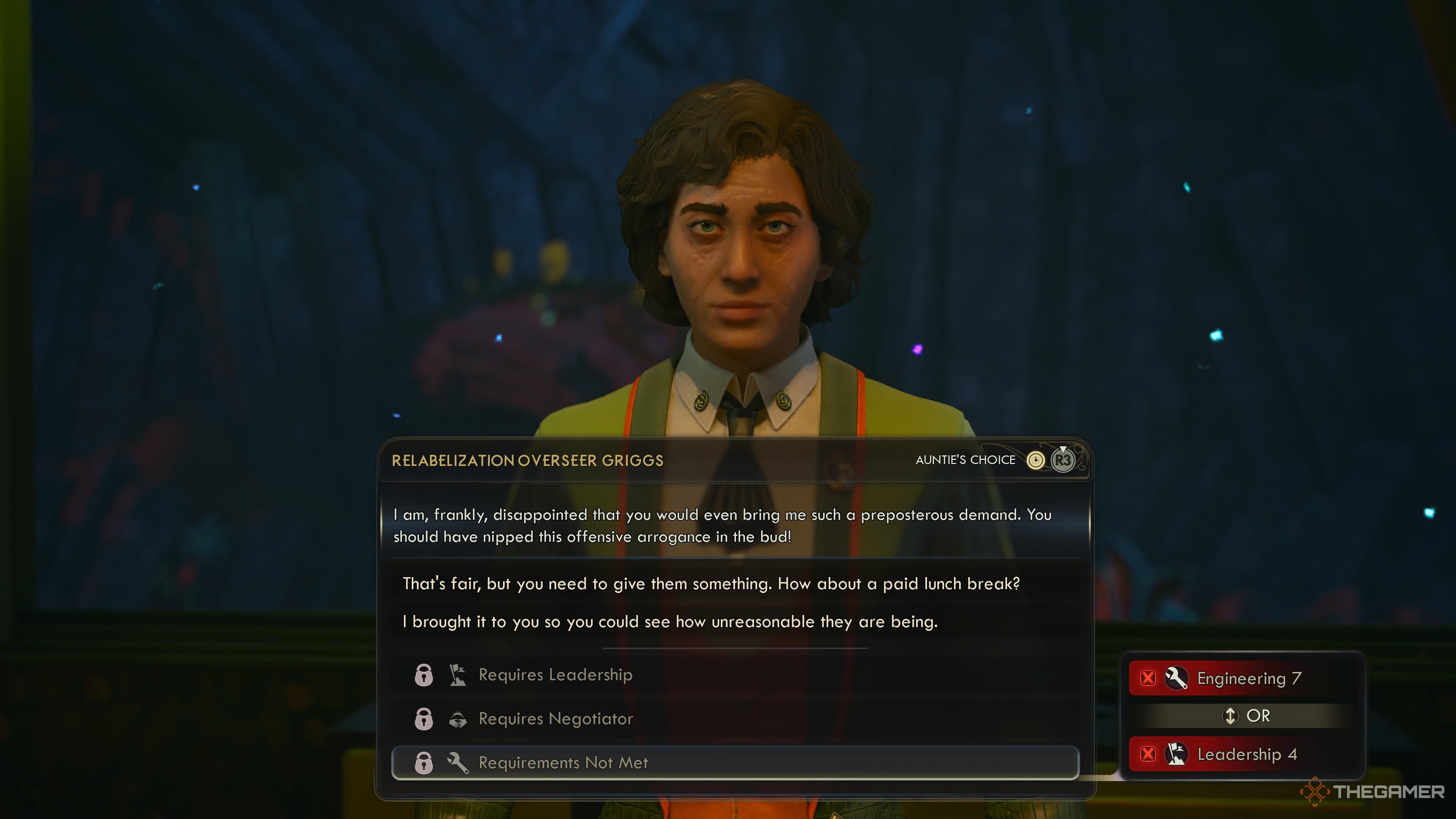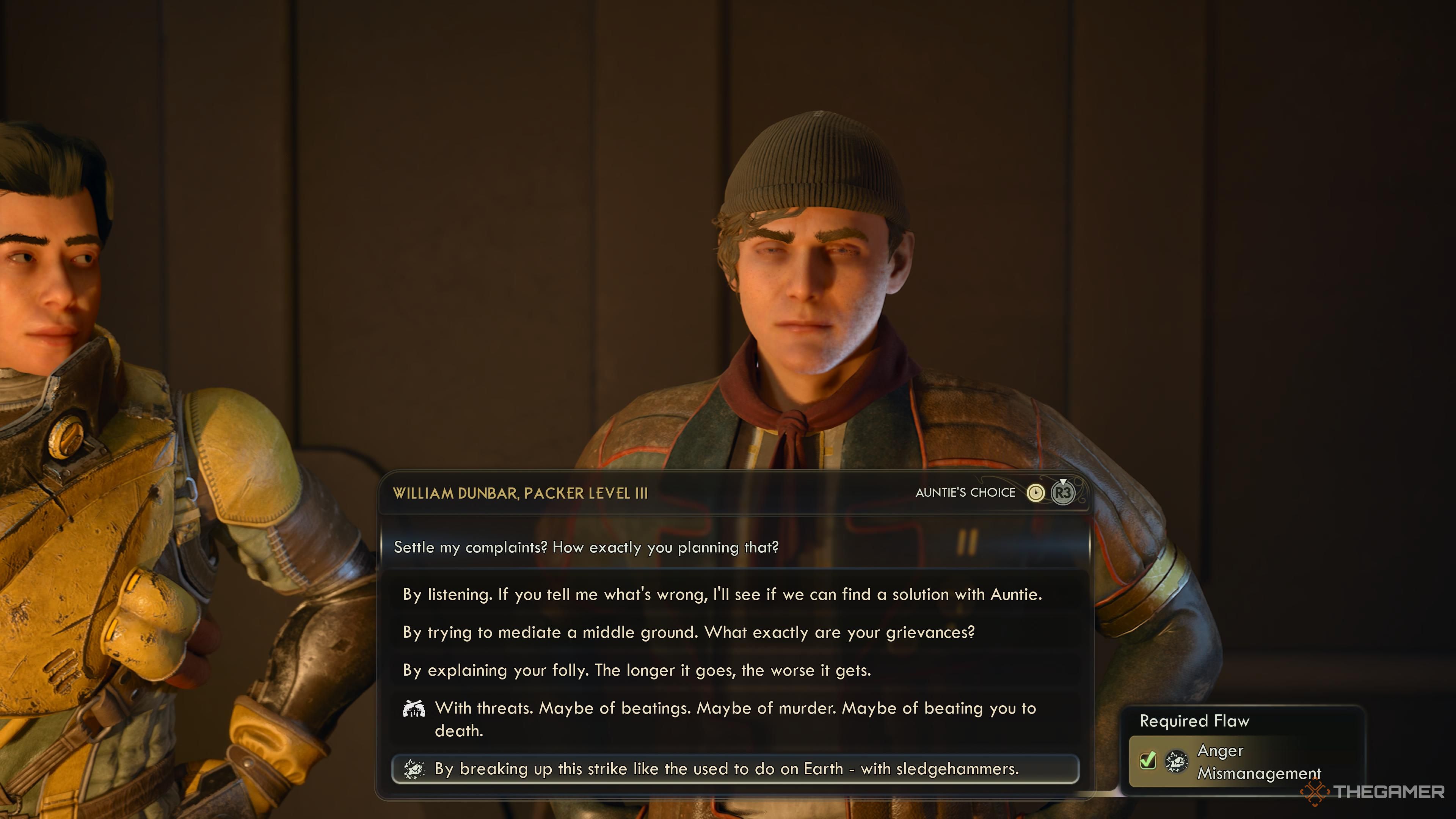 Если переговоры провалятся и вам не удастся достичь решения, у вас есть возможность напрямую угрожать лидерам забастовки, обещая прекратить забастовку силой. Это немедленно спровоцирует бой как с Лео, так и с Данбаром, а также с большим количеством солдат Spacer’s Choice, которые находятся с ними.