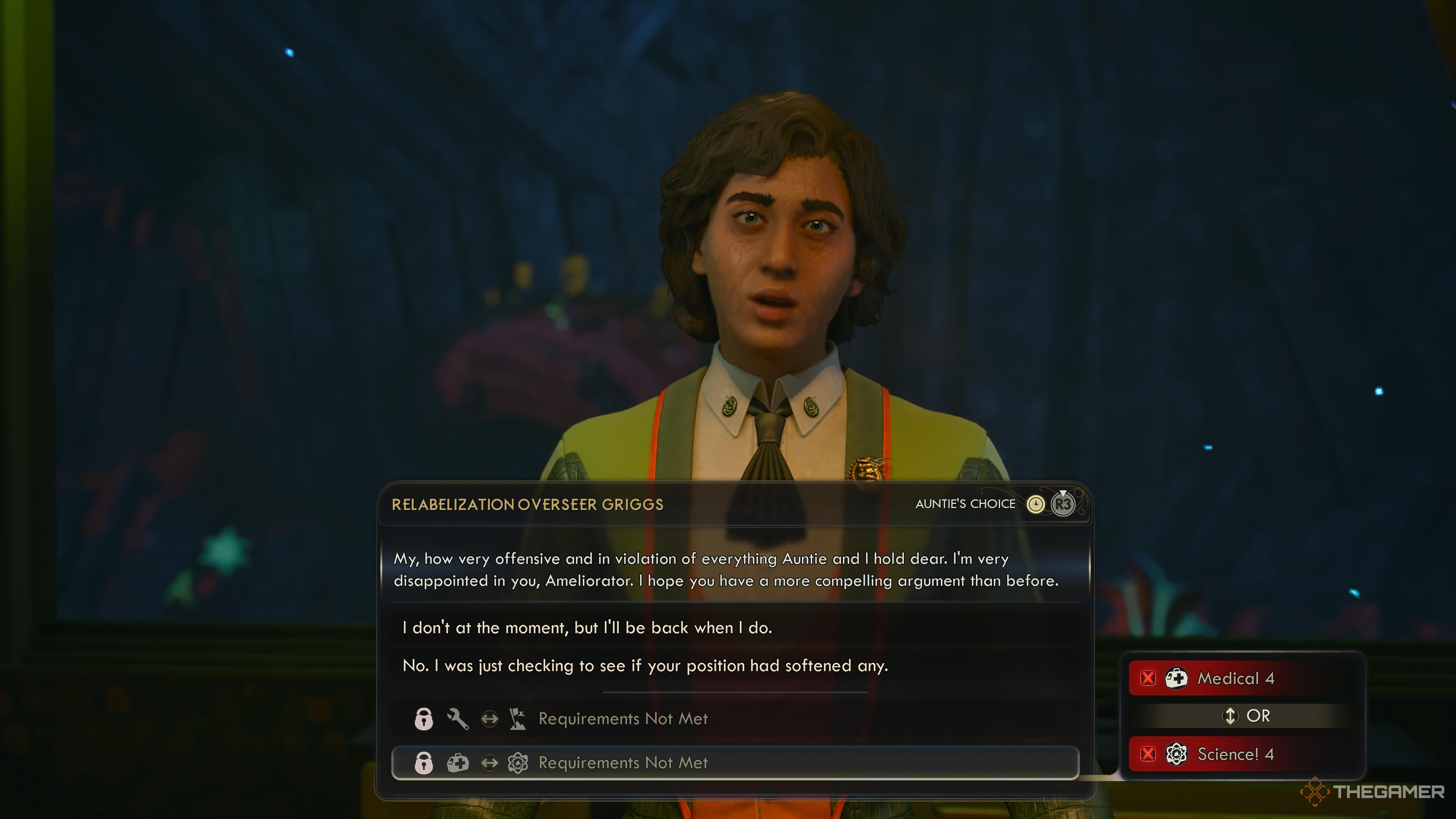 Теперь, когда переговоры завершены, независимо от того, прошли ли они успешно или нет, вернитесь к Данбару и Грею, чтобы отчитаться перед ними. Если они будут недовольны результатами, они отправят вас обратно к Григгсу, чтобы попытаться договориться снова. Вы можете добиться лучших результатов, если пройдете проверку навыков – Инженерия (уровень 7), Лидерство (уровень 4), Медицина (уровень 4) или Наука (уровень 4). В противном случае переговоры, скорее всего, закончатся на этом.