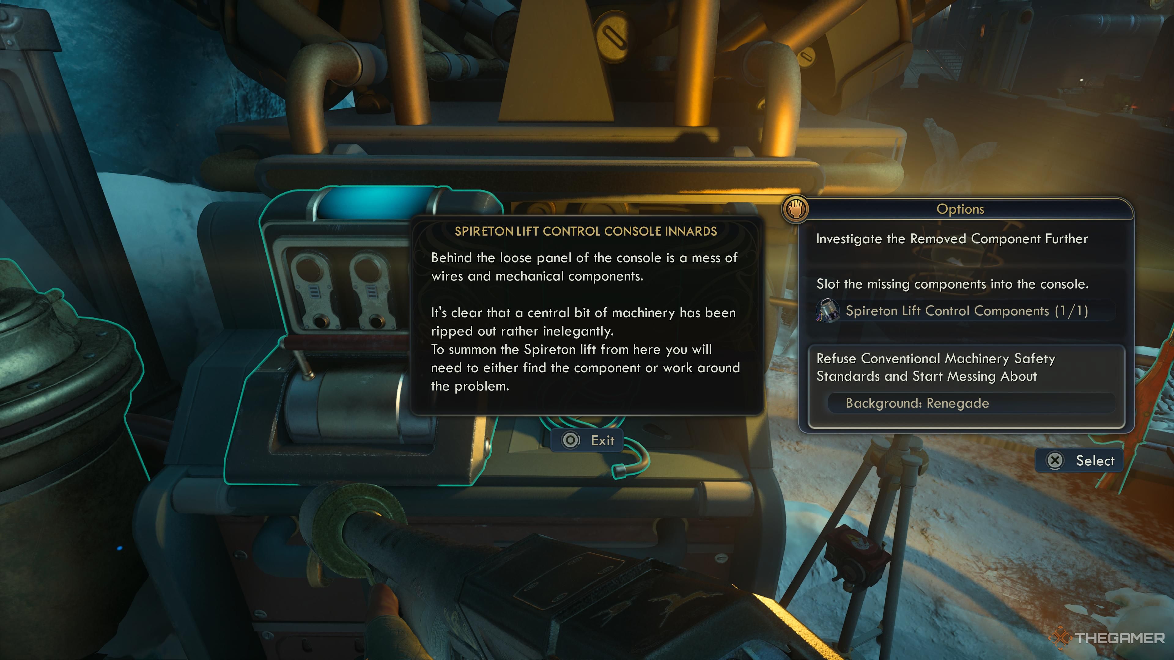 Окей, мне нужно снова запустить лифт Спиретон. Прежде всего, мне нужно найти управление. Сам лифт находится на другой стороне моста, что круто, потому что моя команда может использовать его, чтобы незаметно приблизиться к Протекторату. К счастью, управление находится на моей стороне, что облегчает мне возможность сразу же его захватить. Как только я его получу, у меня будет множество различных способов действительно запустить лифт. Вот что я могу сделать: