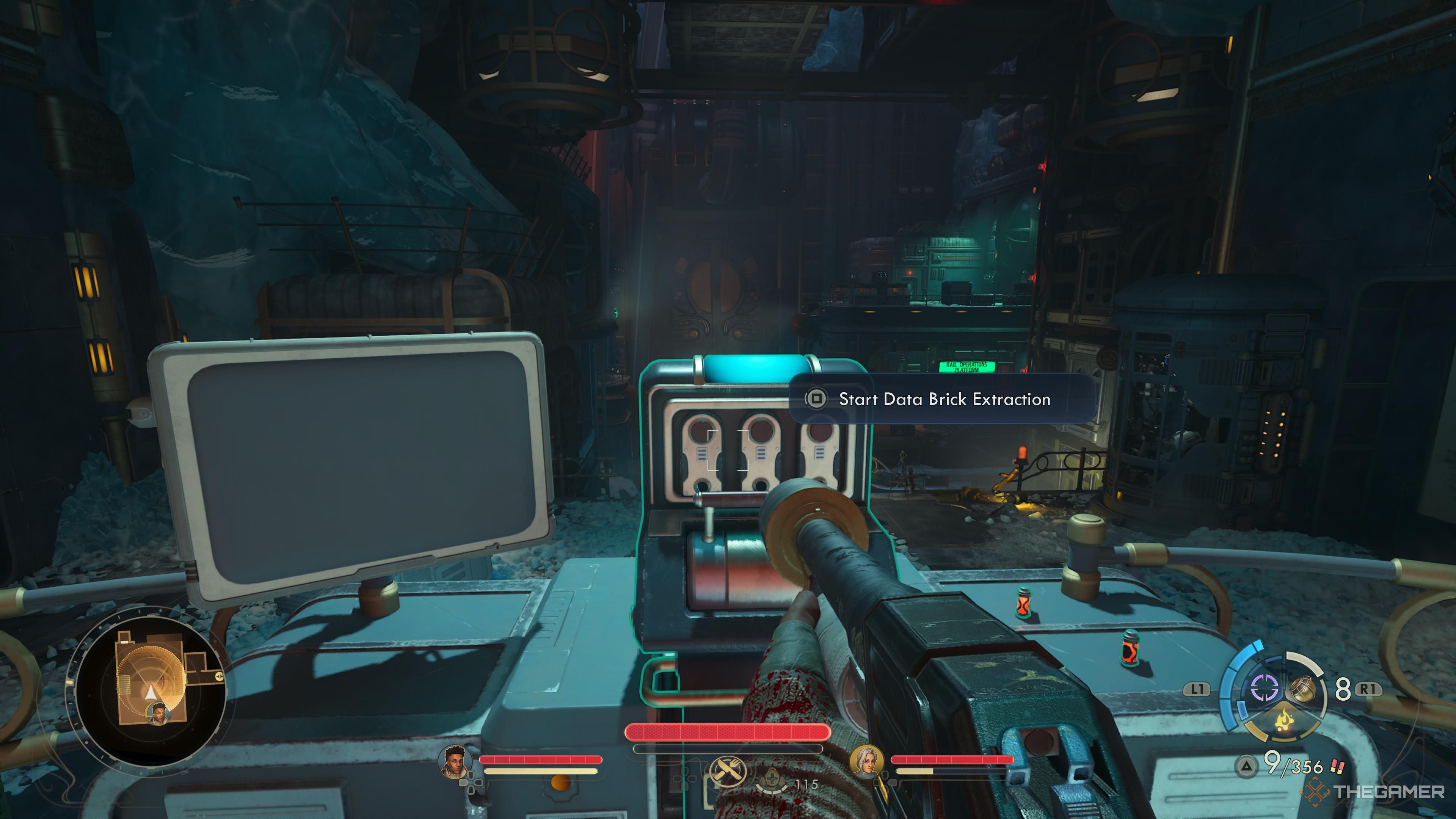Оказавшись внутри, вы найдете ученого в комнате справа, а также консоль. Эта консоль позволяет заморозить всех врагов в области, но это не требуется для продвижения. Продолжайте по коридору и поднимитесь на лифте. Наверху найдите и используйте следующий лифт, который находится прямо перед вами. После победы над врагами в этой комнате потяните за рычаг, чтобы начать извлечение Data Brick.