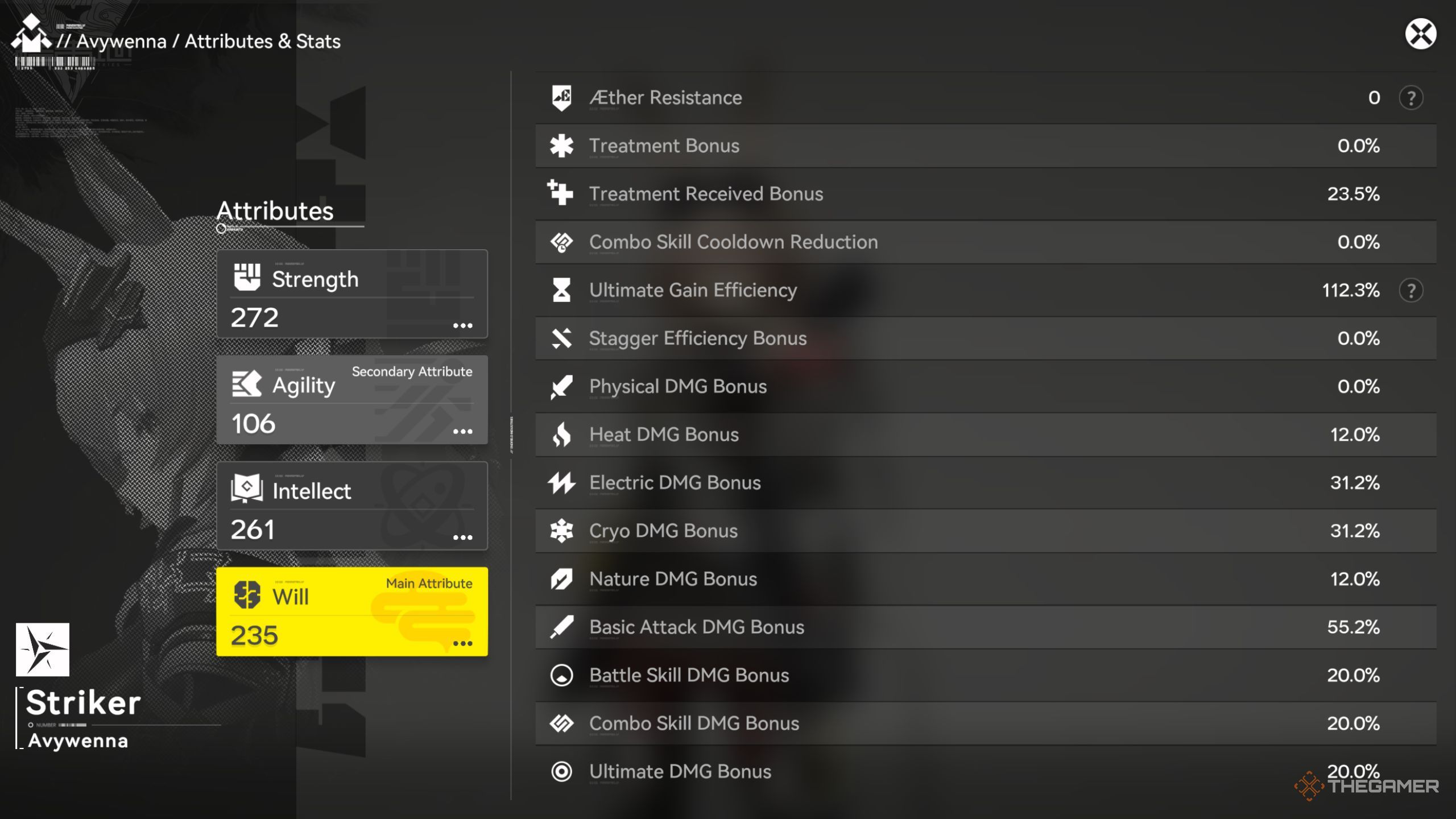 Помимо основных функций четырех главных характеристик персонажа, каждый персонаж также имеет основную и вторичную атрибуты. На экране персонажа основная атрибута выделена золотым цветом, а вторичная атрибута имеет серый фон.