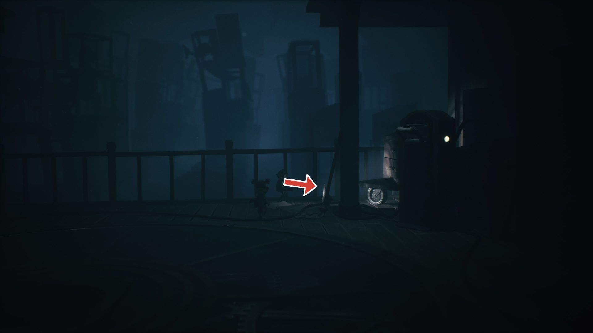 После того, как вы разгадаете головоломку, заберитесь на ящики рядом с машиной и потяните за рычаг. Затем начните возвращаться тем же путем, и из-за некоторых ящиков выбежит маленькое существо.