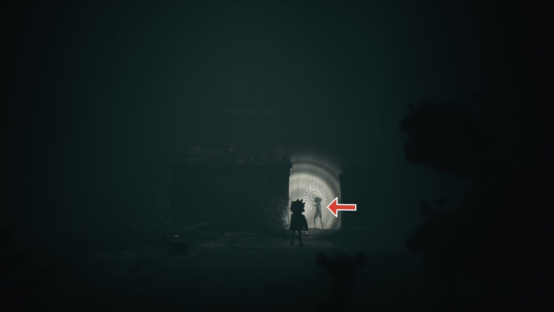 После того, как вы перейдете, пройдите по длинному коридору. Вы найдете второе привидение, рисующее на стене между мусорным баком и контейнером. Подойдите к нему достаточно близко, чтобы игра распознала, что вы его обнаружили.
