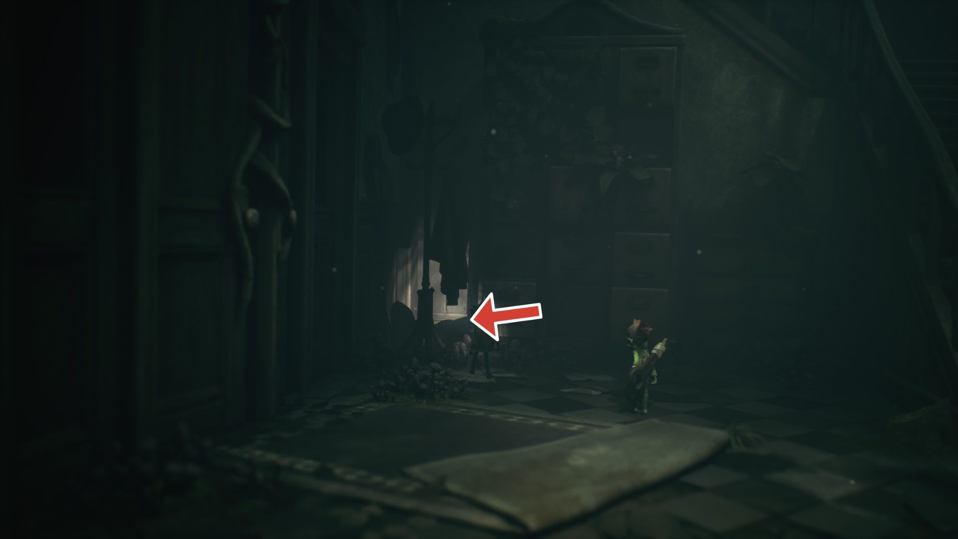 Как только вы заберетесь в окно, вы увидите большую лестницу. Не беспокойтесь об этом пока – вместо этого направляйтесь к заднему левому углу комнаты. Вы найдете призрака возле шкафов и вешалки для одежды.