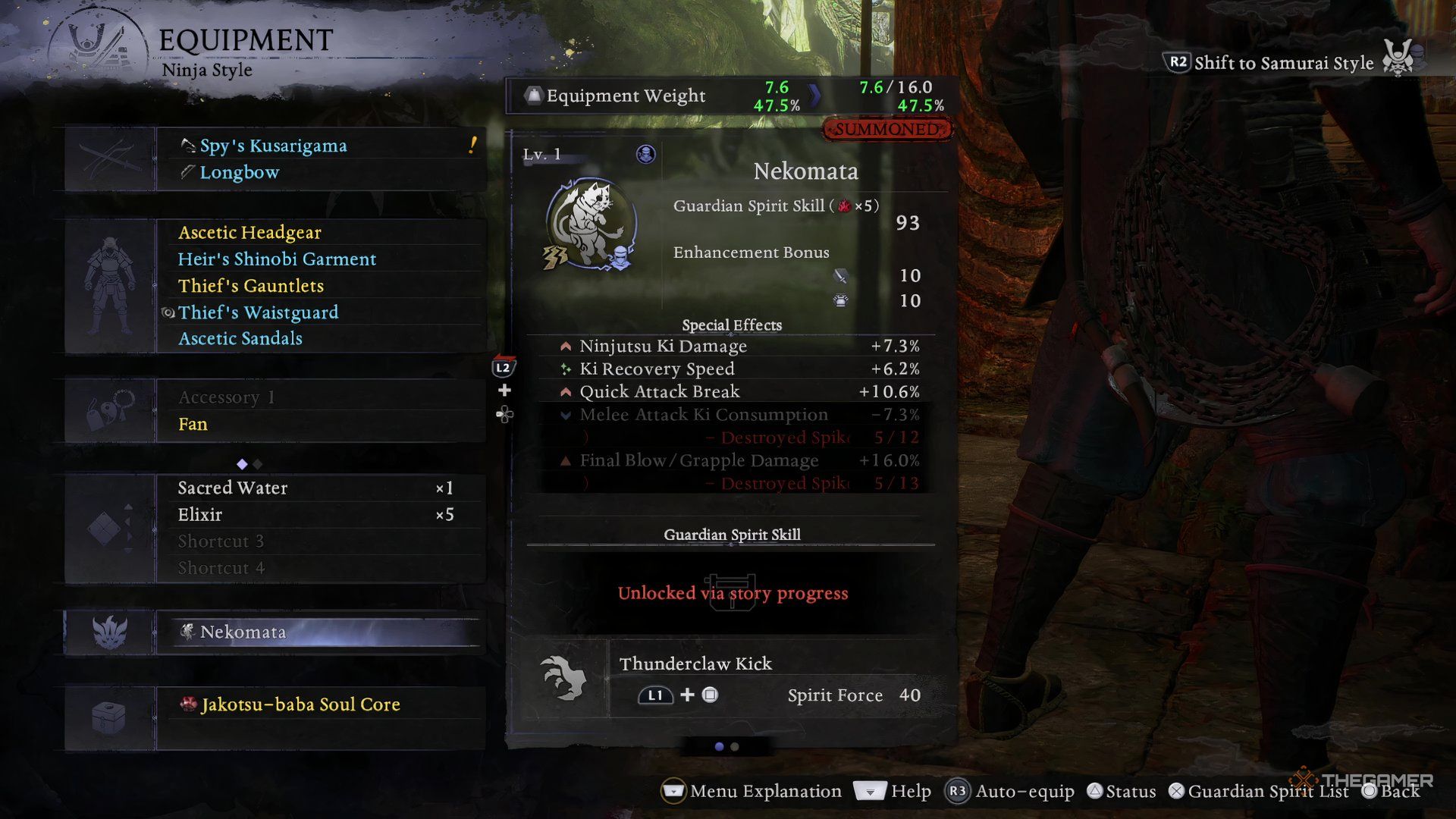 Несмотря на то, что Nekomata доступна с самого начала, она остаётся лучшим Духом-Хранителем для билдов, ориентированных на ниндзя в Nioh 3, особенно для тех, кто использует Кусаригама. Это связано с тем, что её бонусы – повышенный урон от Ниндзюцу Ки, более высокая скорость восстановления Ки и улучшенный пробой быстрой атаки – идеально дополняют быстрый, мобильный стиль игры.