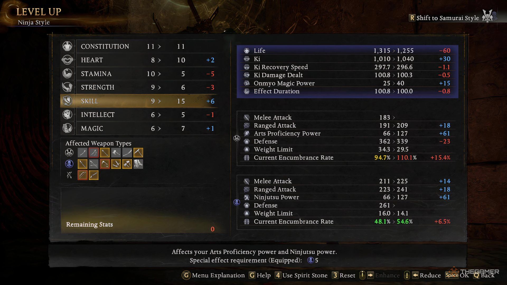 Понятно, что хочется повысить своё здоровье с помощью Телосложения для дополнительной безопасности, но эта сборка действительно сияет, когда вы сосредотачиваетесь на увеличении Силы Искусств и Ниндзюцу за счёт более высоких уровней Навыков. Вместо того, чтобы полагаться на жёсткие характеристики, ваше выживание зависит от уклонения от атак и эффективного управления Ки.