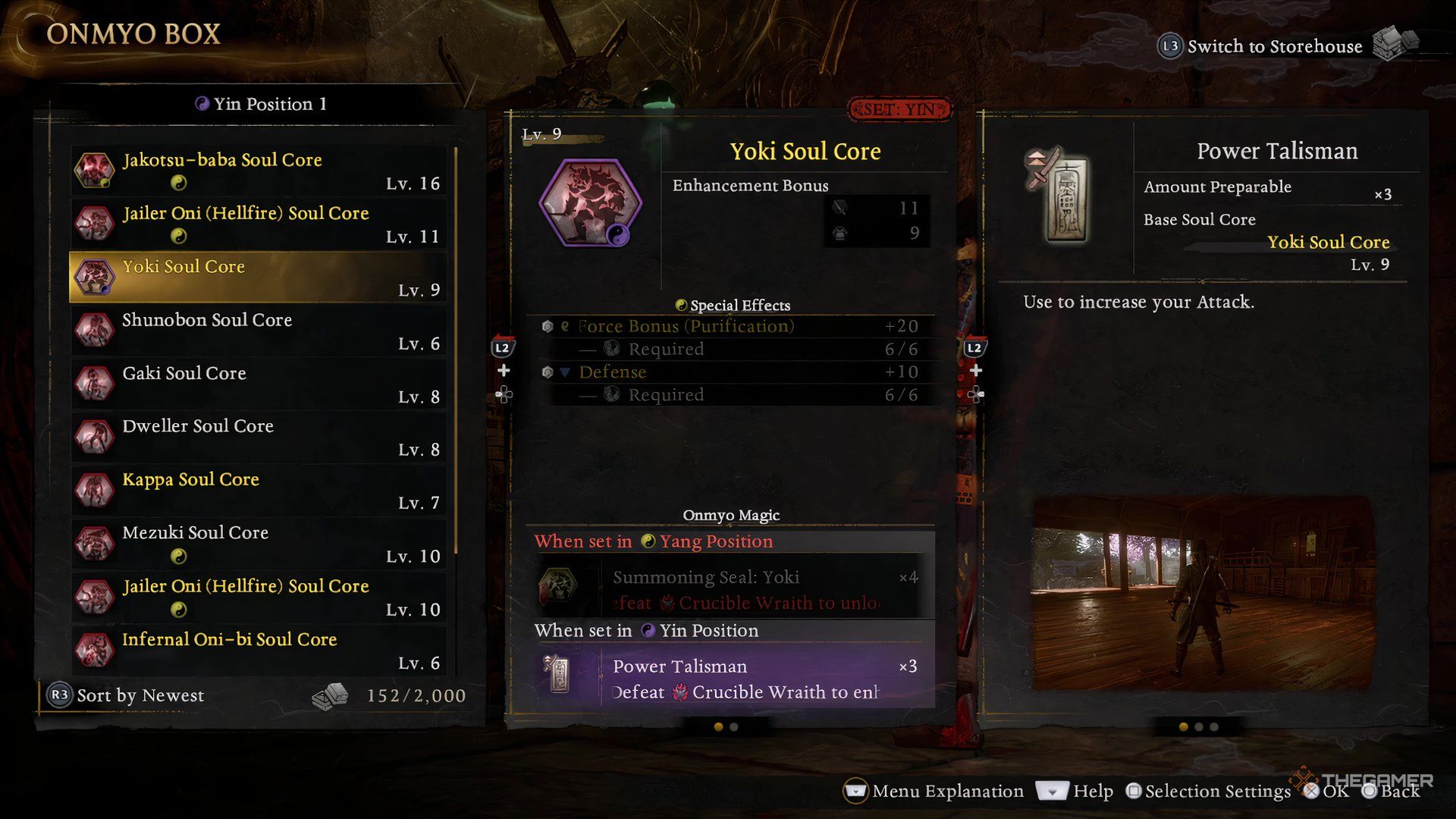 Для Инь, Ядро Души Ёки – это хороший выбор при столкновении с Испытаниями, поскольку оно повышает Силу Духа и Защиту. Оно предоставляет пять Талисманов Силы, которые увеличивают вашу Атаку – противоположность Талисманам Слабости, которые снижают Защиту. В любом случае, вы увидите полезное увеличение вашего урона.