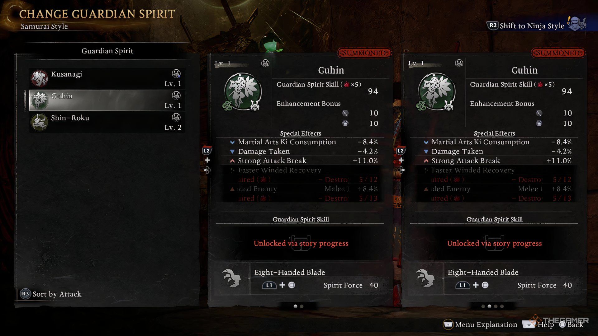 Guhin — отличный Дух-Хранитель для сочетания со сборкой Odachi, поскольку он усиливает вашу защиту и хорошо сочетается с агрессивной тактикой ближнего боя. Он помогает вам эффективно сражаться, снижая затраты Ки на боевые искусства, уменьшая входящий урон и повышая вероятность того, что ваши Сильные Атаки сломают защиту противника. Это позволяет вам оставаться в бою и обмениваться ударами, не нуждаясь в постоянных уклонениях.