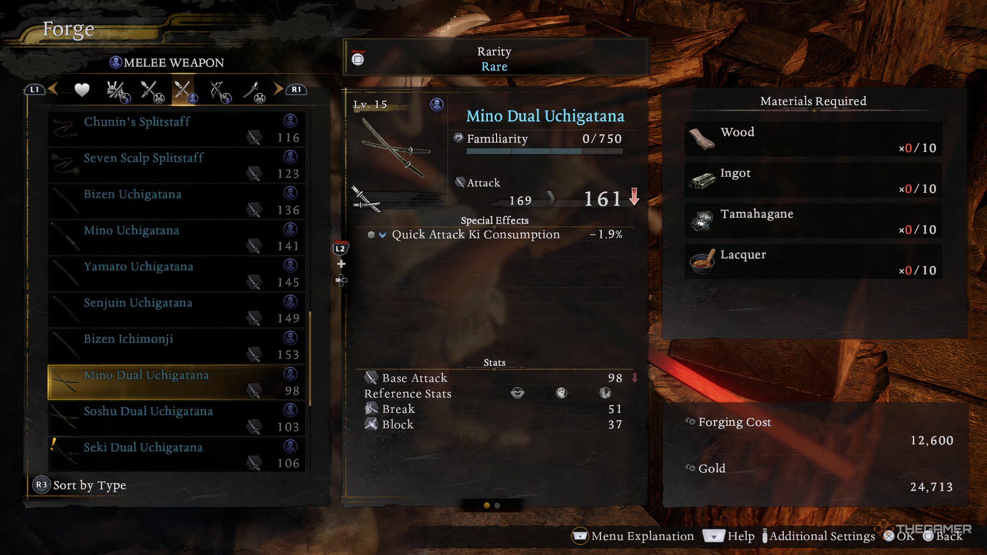 Вы можете довольно быстро получить двойной Утигатан Мино в Nioh 3, выковав его в Вечном Разломе у Кузнеца в лисьей маске. Для этого потребуется десять единиц каждого из этих материалов: Дерево, Слиток, Тамахаганэ и Лак.