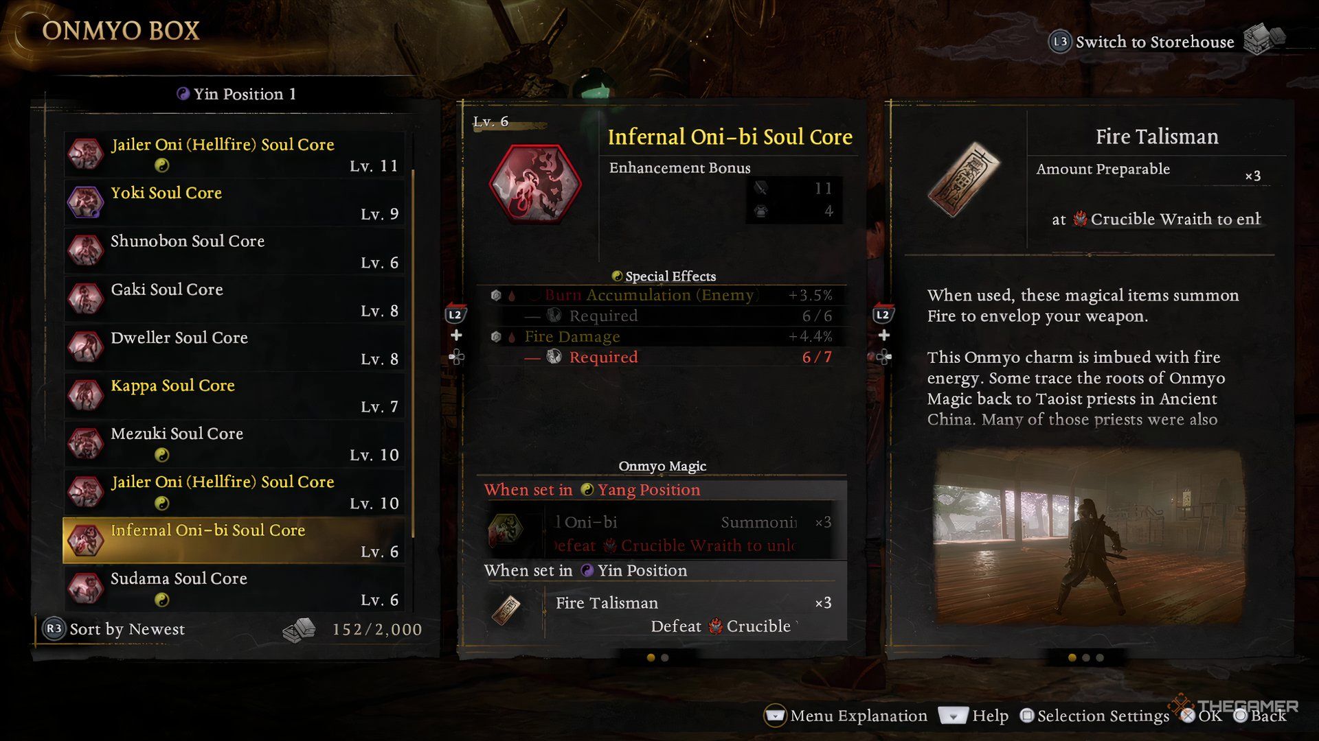 При создании своего Ядра Души, сосредоточьтесь на быстрых атаках и сильных элементальных эффектах вместо того, чтобы просто пытаться быть выносливым. По этой причине, Kamaitachi в позиции Ян — отличный выбор – он увеличивает ваш урон от Ветра и снижает стоимость Ки для уклонения, облегчая накопление Путаницы и эффективное управление вашим Ки.