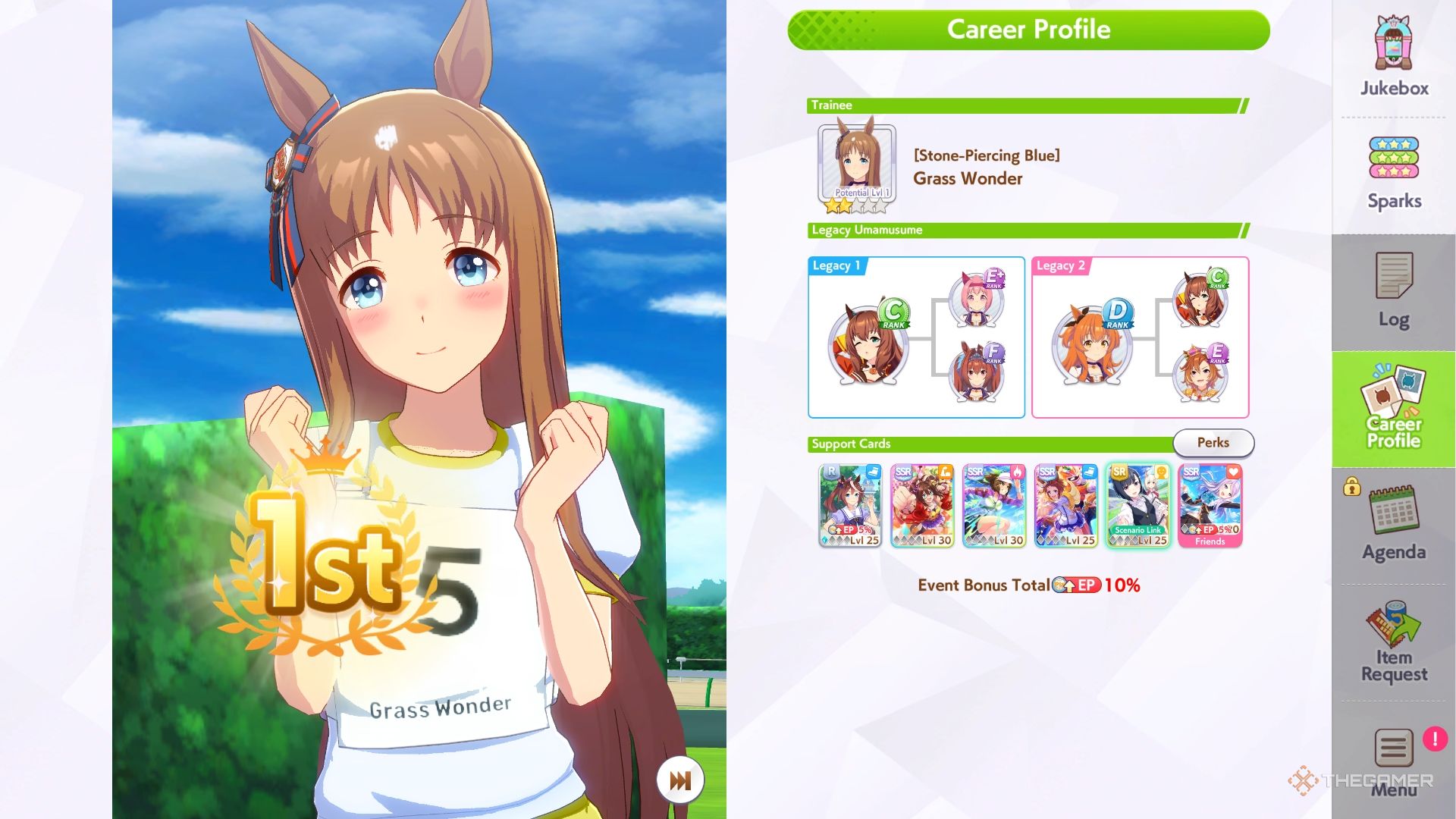 Второй унаследованный гонщик может улучшить выносливость Grass Wonder и также повысить её интеллект, создавая более сбалансированный набор характеристик. Возможно, потребуется несколько попыток, чтобы получить идеальных родителей-гонщиков, но усилия будут вознаграждены.