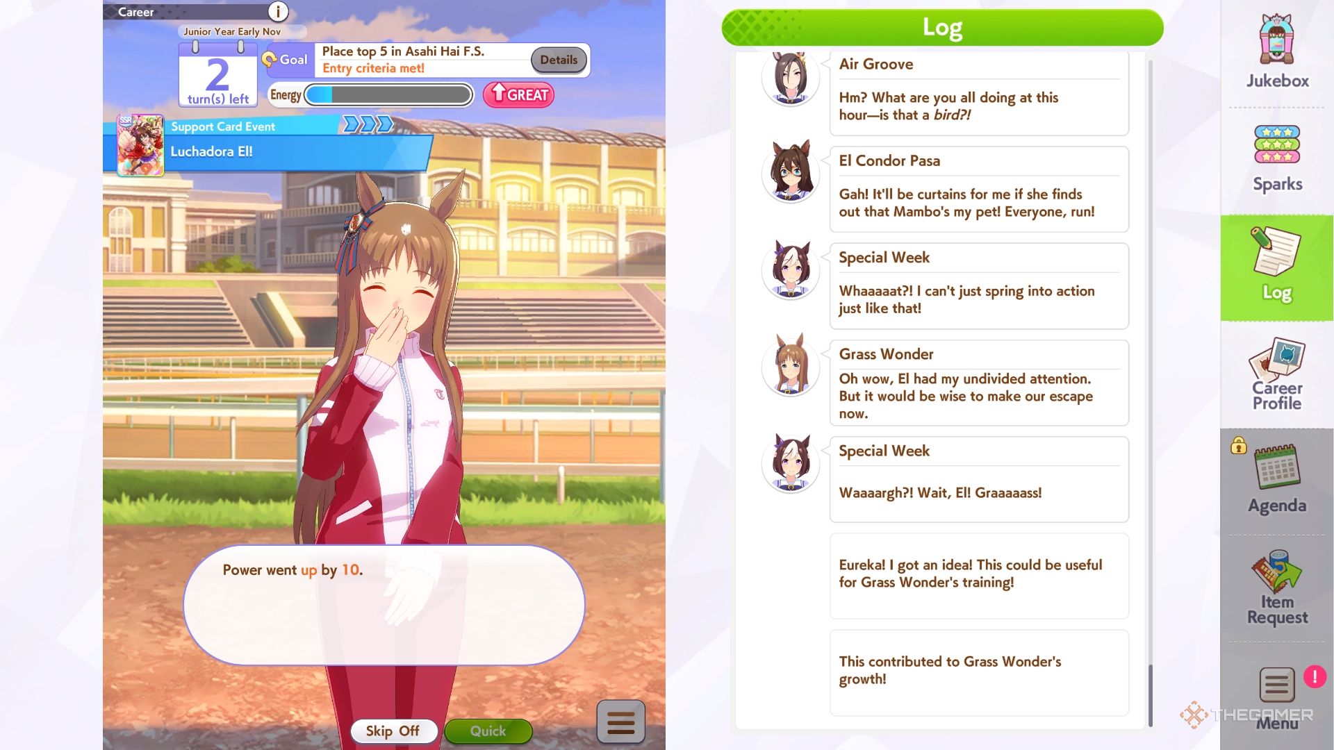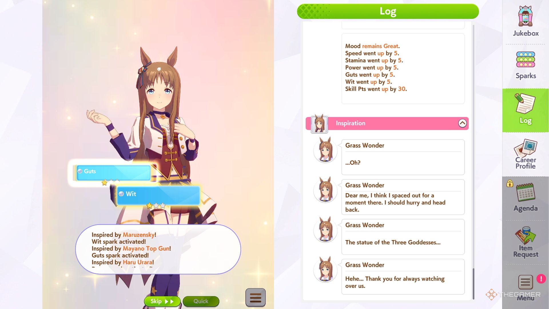 Улучшение сообразительности Grass Wonder позволит ей использовать свои способности и находить лучшие места на гоночной трассе. В режиме карьеры это также восстанавливает её энергию, помогая вам извлечь максимум пользы из каждого поворота.