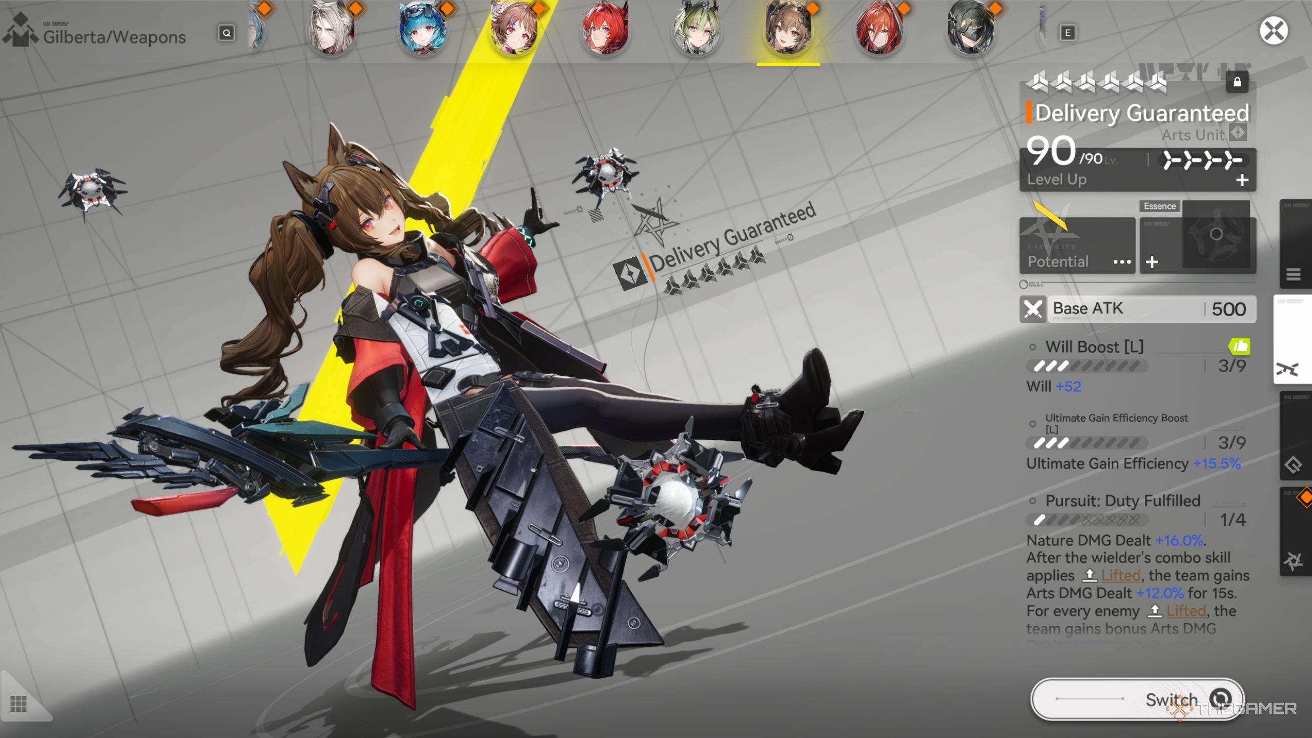 | Доставка гарантирована | 6 Звезд | Воля, Абсолютная Эффективность Прироста, Стремление | В то время как Ultimate Gain Efficiency уже делает это оружие отличным для Жилберты, она также предоставляет огромный бонус к Урону от Искусств всей команде , когда оно экипировано.