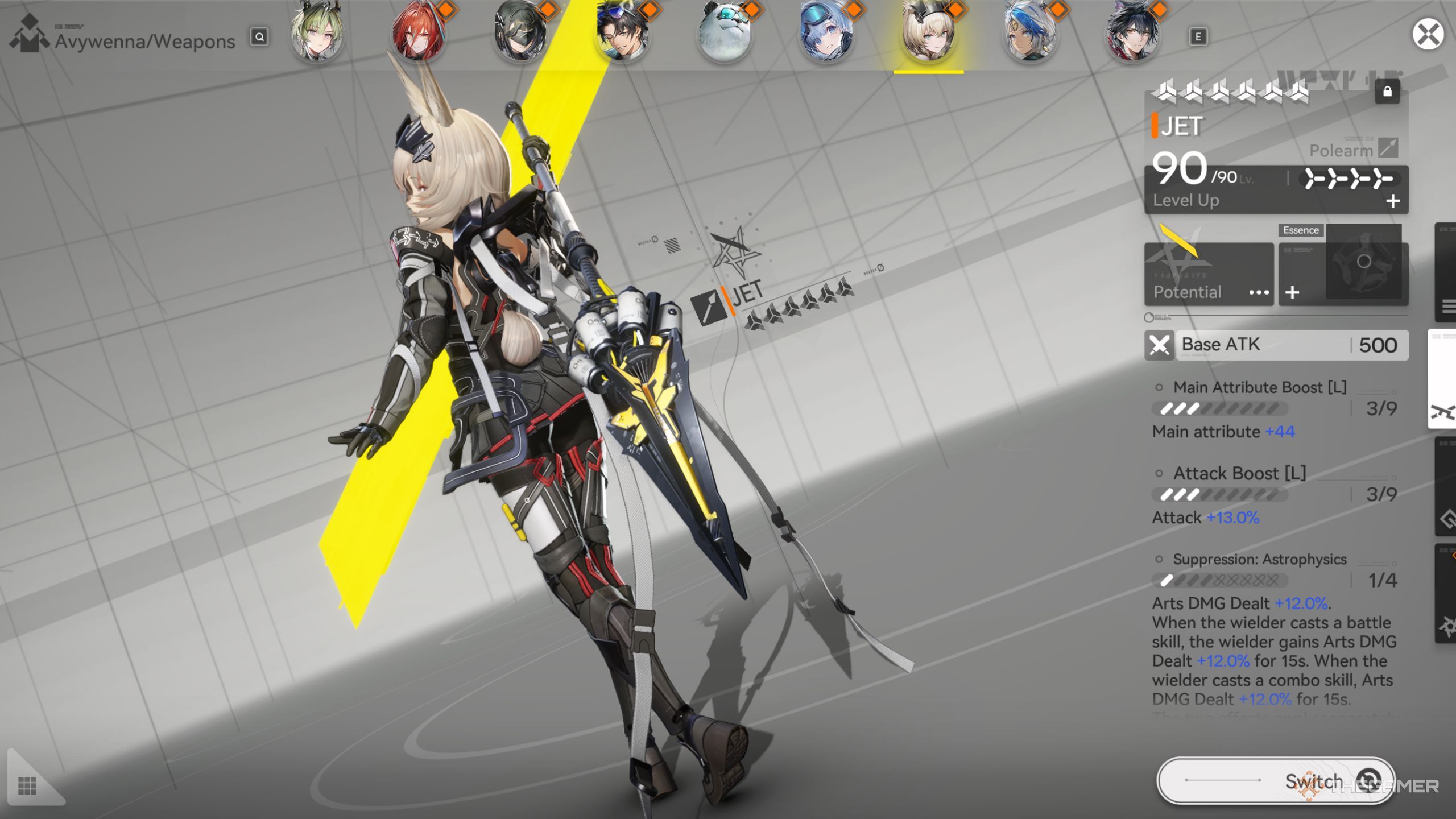 | JET | 6 Звезд | Основная характеристика, АТК, Подавление | Это оружие даёт Авивенне бонус к урону от Искусств просто за счёт того, что оно экипировано на ней. Этот бонус дальнейшим образом усиливается, когда она использует своё боевое или комбо-навык. |
