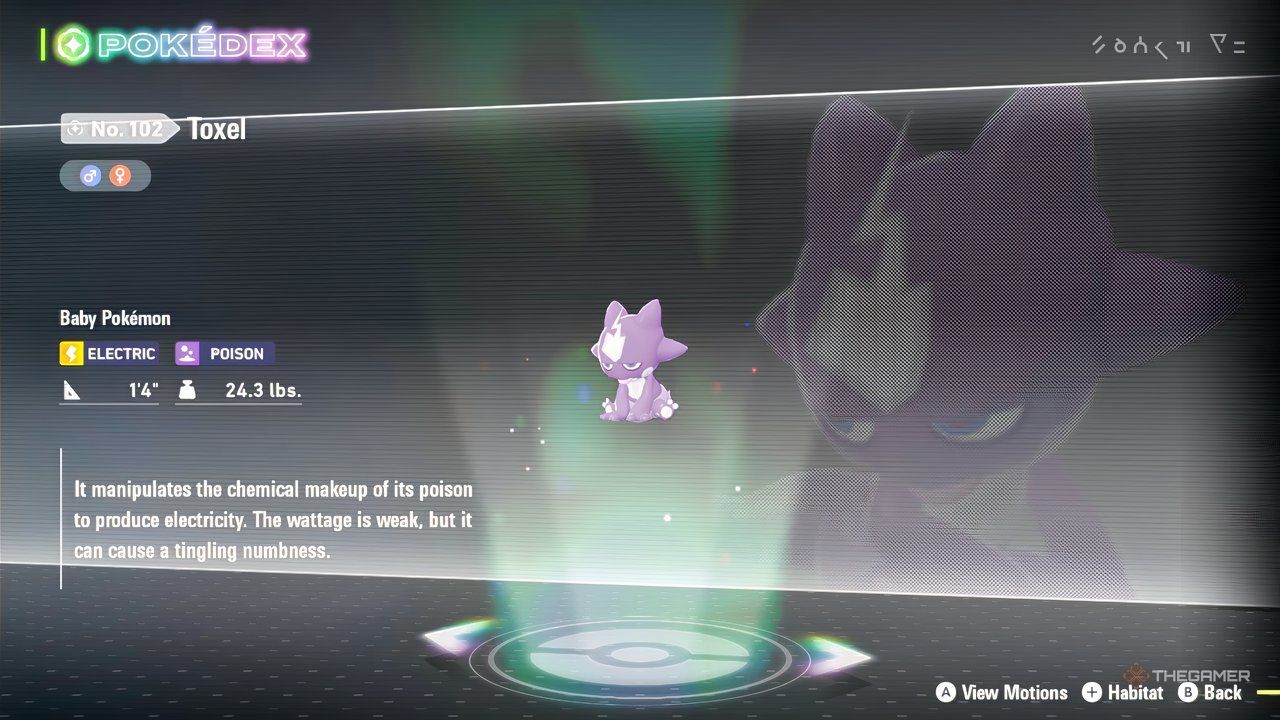 Toxel — хороший покемон для охоты на блестящих особей в начале вашего путешествия по Mega Dimension, особенно если вы стремитесь собрать ‘Living Shiny Dex’ – то есть, вы хотите хотя бы одну блестящую версию каждой эволюции покемона.