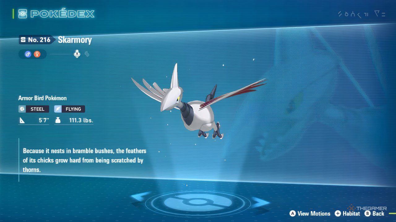 Skarmory был доступен в оригинальной Pokémon Scarlet и Violet до выхода Teal Mask DLC. Однако найти его блестящую форму было крайне сложно. Это было связано с тем, что Skarmory появлялся только в одном конкретном месте – Зоне Один в Дикой Зоне – и быстро улетал, паря над большой группой Pyroar, что делало встречу с блестящей версией очень сложной.