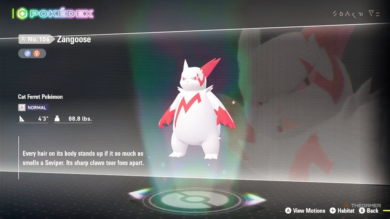 Zangoose — ещё один покемон, который не эволюционирует, что значительно упрощает завершение Shiny Living Dex — вам нужен только один! Кроме того, есть 50/50 шанс, что он будет мужского или женского пола, поэтому достать блестящую версию обоих полов не так уж и сложно. Ты заслужил этот перерыв после того, как разобрался с Charcadet!