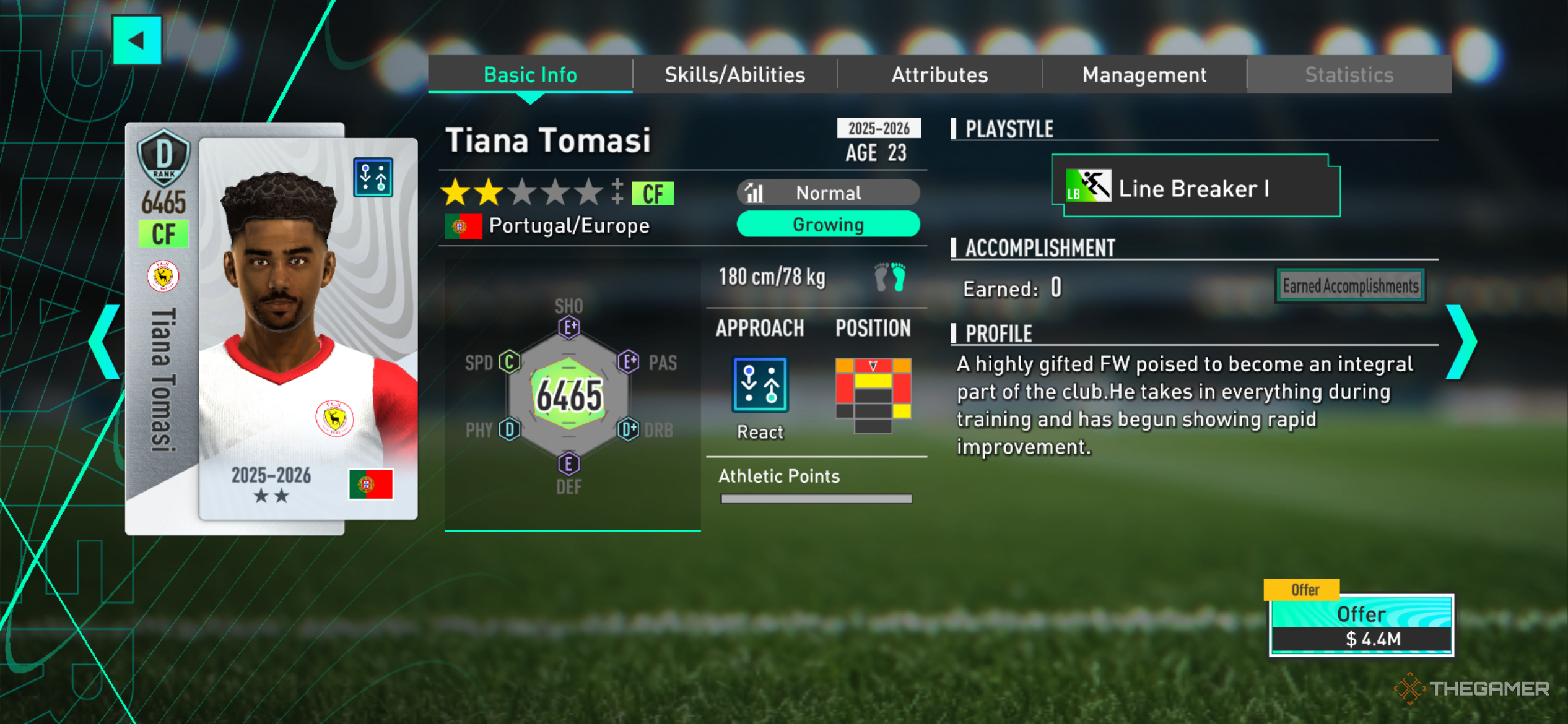 Тиана Томаси – очень быстрый игрок, скорость – его самое большое преимущество. Он также обладает чертой Line Breaker и может играть на нескольких атакующих позициях, что делает его универсальным вариантом для различных командных составов.
