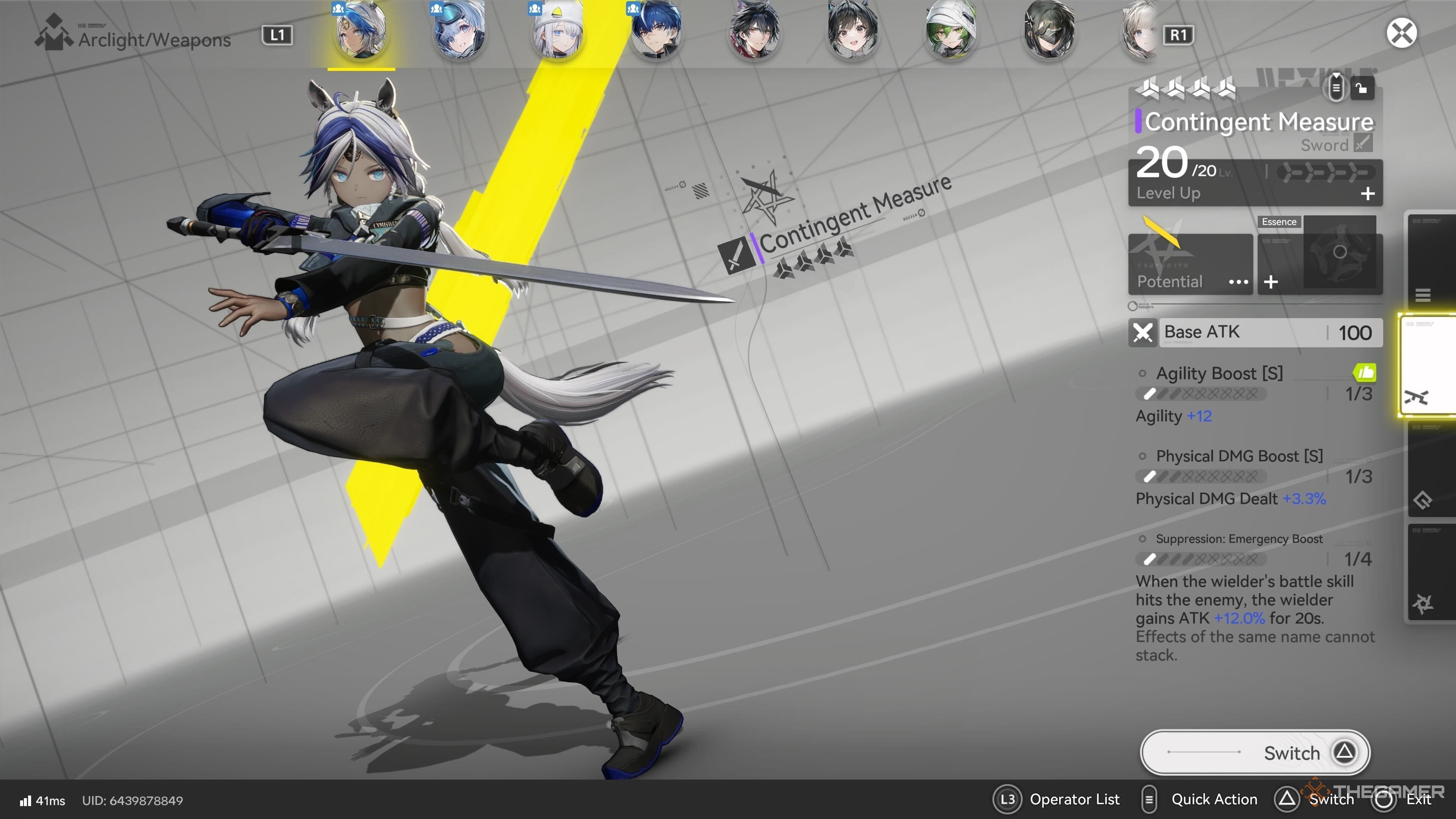 Вы можете заметить, что усиления характеристик на OBJ Edge of Lightness почти идентичны тем, что у фирменного оружия Arclight в Twelve Questions, но отличие заключается в том, что оно обеспечивает чуть более 8% увеличения урона для всей команды после того, как Arclight восстанавливает любое количество SP, что происходит довольно часто из-за движений в её наборе навыков. |