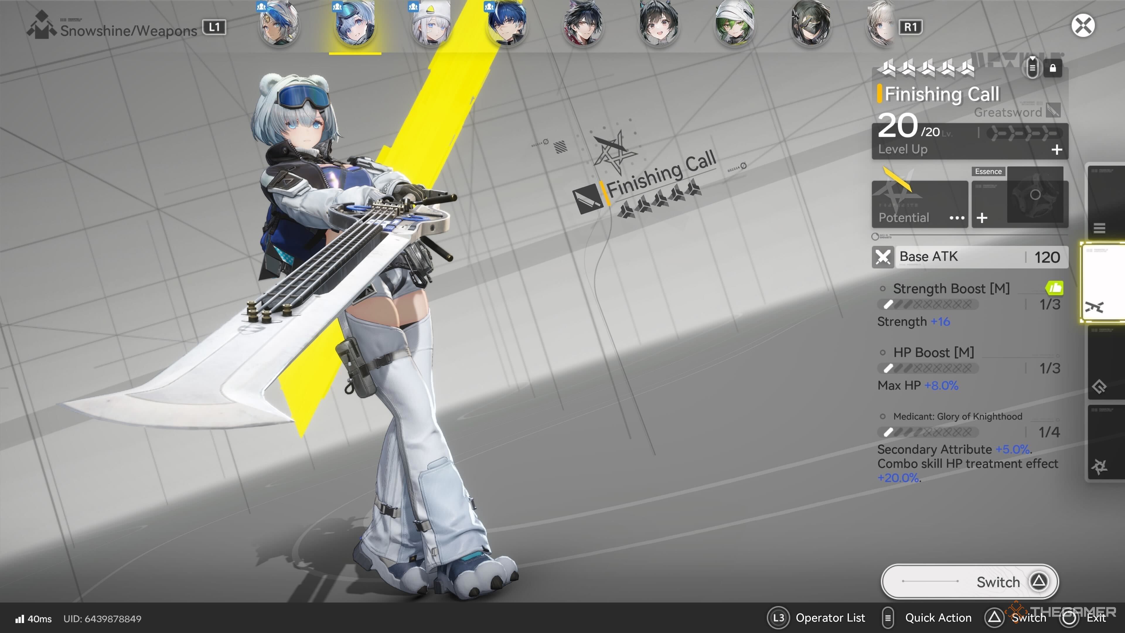 - Хотя Сноушайн передвигается медленнее и использует двуручный меч в качестве основного типа оружия, её Обычная Атака может наносить до трёх ударов с хорошим физическим уроном. Если вы активно ей управляете, её финальный удар наносит целых 23 Stagger.