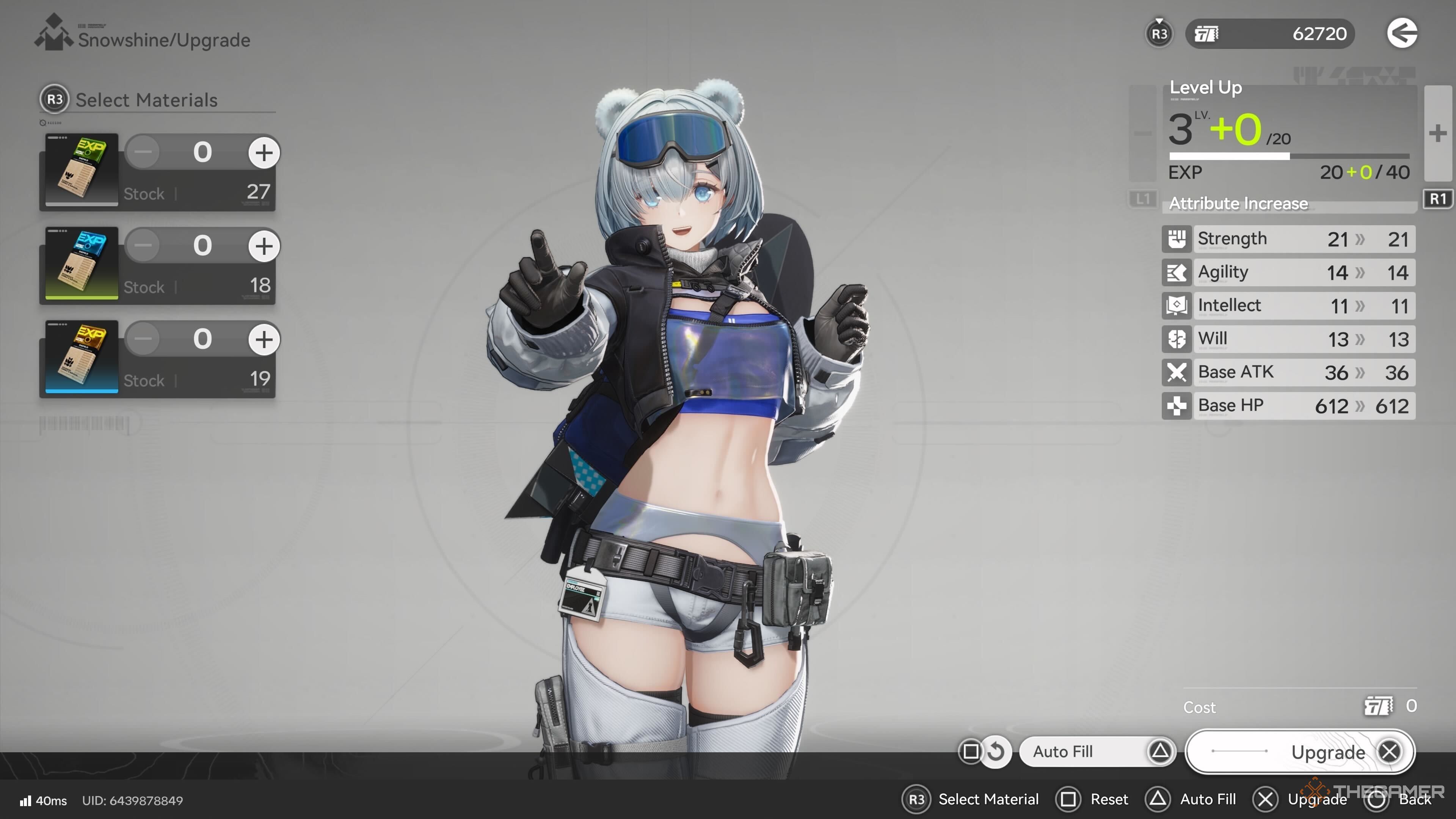 Snowshine разработана как выносливый оператор, который отдает приоритет Силе, чтобы выступать в роли крепкого защитника. Ей также полезно повышать Волю, что усиливает эффективность её мощных способностей к командной поддержке и исцелению.