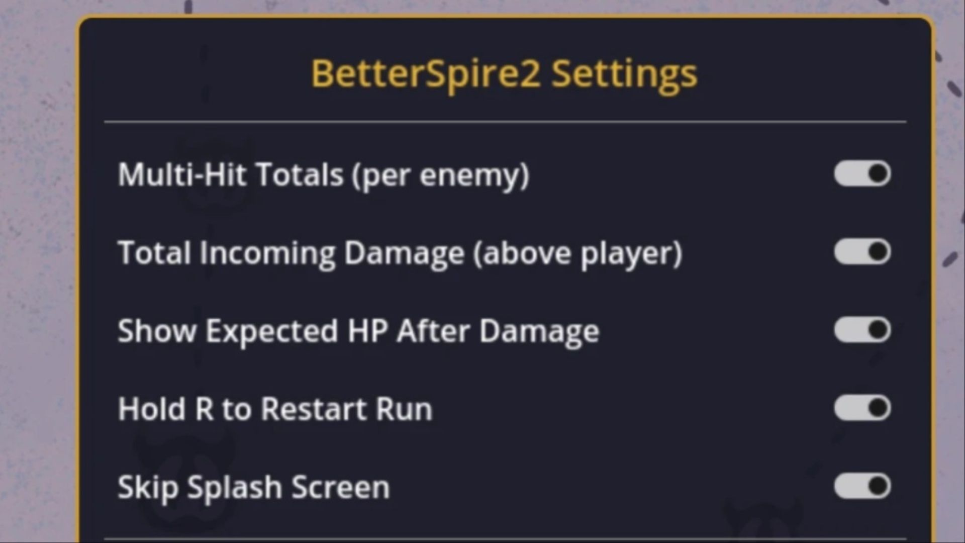 Далее следует мод Better Spire 2 от jdr1813. Он включает в себя множество улучшений, и вы можете настроить, какие из них активны во время игры. Действительно полезная функция — возможность мгновенно перезапустить прохождение, удерживая клавишу ‘R’ — идеально, когда что-то идет не так, и вы хотите сразу же вернуться к новой попытке (и поверьте нам, это случается очень часто!).