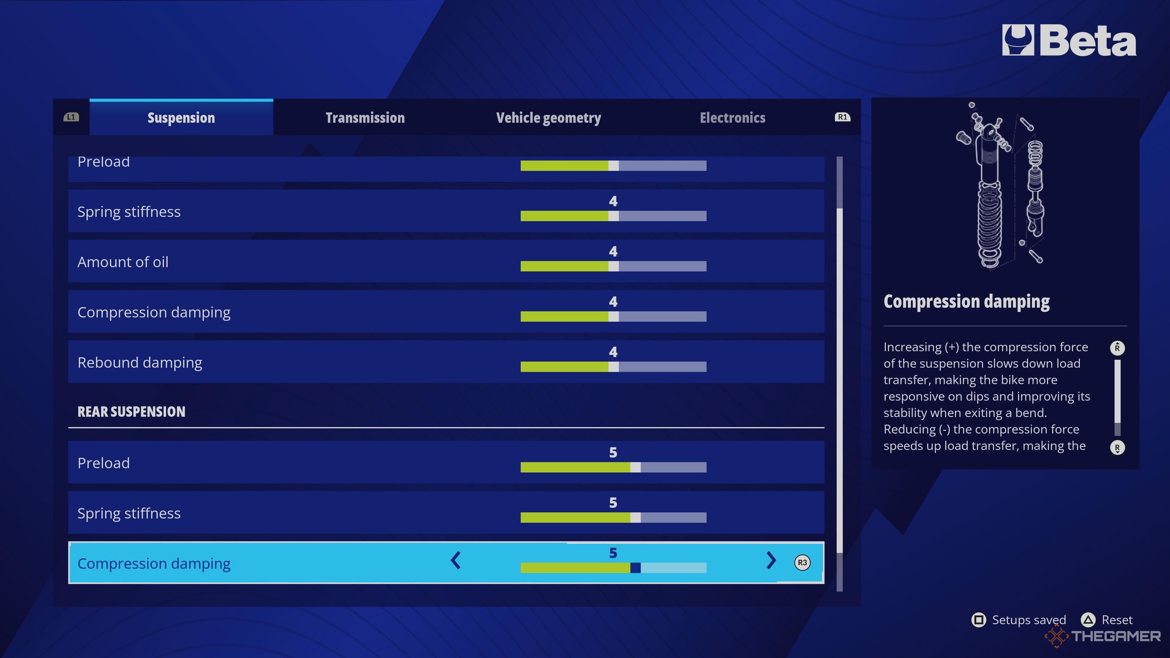 Рекомендуется отрегулировать заднюю подвеску, установив предварительную нагрузку, жесткость пружины, сжатие амортизаторов и отскок амортизаторов на 5. Подстройте эти параметры по мере тестирования и езды.