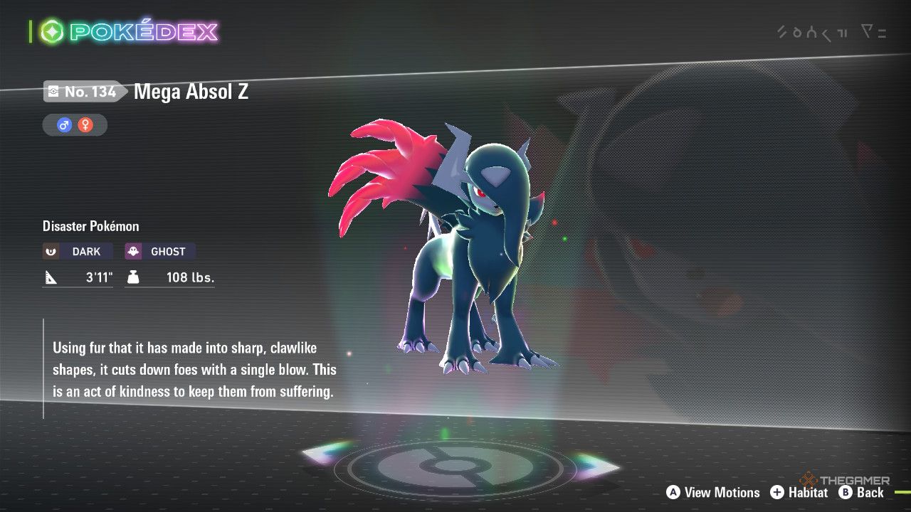 Хотя общая статистика может показаться такой же, как у обычного Mega Absol, Mega Absol Z на самом деле сильно отличается. Его самое большое улучшение — Скорость, достигающая впечатляющих 151. Этот прирост происходит за счёт перераспределения очков из его Специальной Атаки, которая и раньше не была очень полезной.