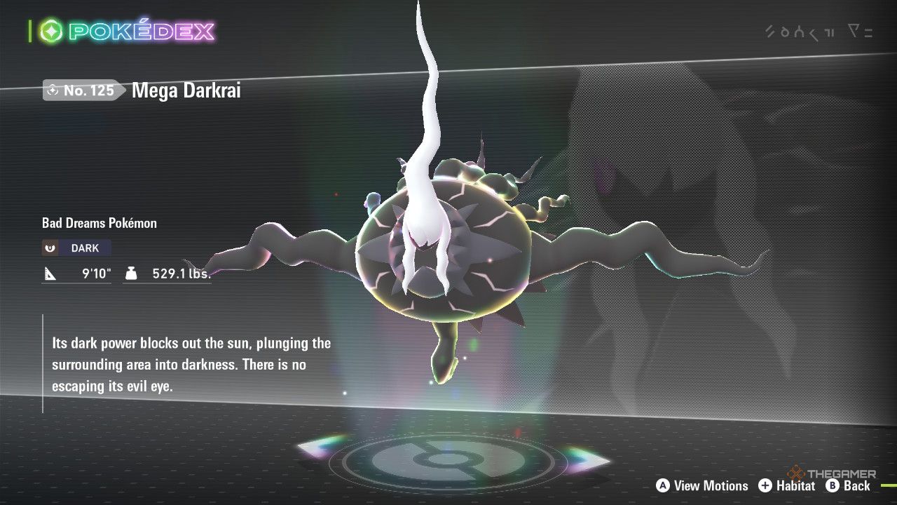 Окей, так что Даркрай — это очень важный персонаж в истории Mega Dimension DLC, но, честно говоря, именно его характеристики действительно привлекли моё внимание. Он получает огромное увеличение базовых характеристик на 100 при Мега-Эволюции, как и многие другие легендарные покемоны, но круто то, что эти характеристики распределены очень хорошо. Он не просто супер силён в одной области — он хорош во всём, что делает его действительно мощным покемоном для использования.