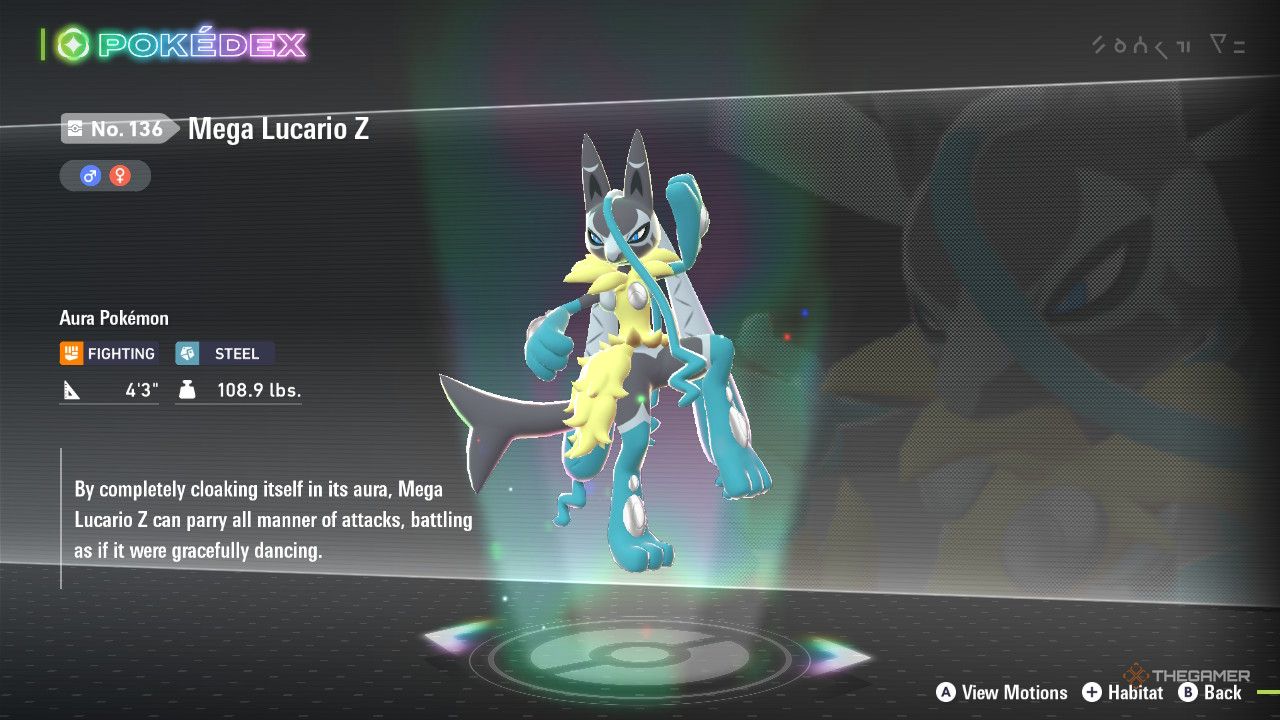 Оригинальная Мега-эволюция Люкарио была в целом хорошей, но имела странный недостаток: она была создана для физических атак, хотя его самая известная атака, Aura Sphere, использует силу Специальной Атаки. Mega Lucario Z решает эту проблему, корректируя характеристики Покемона, чтобы лучше подчеркнуть его Скорость и Специальную Атаку.