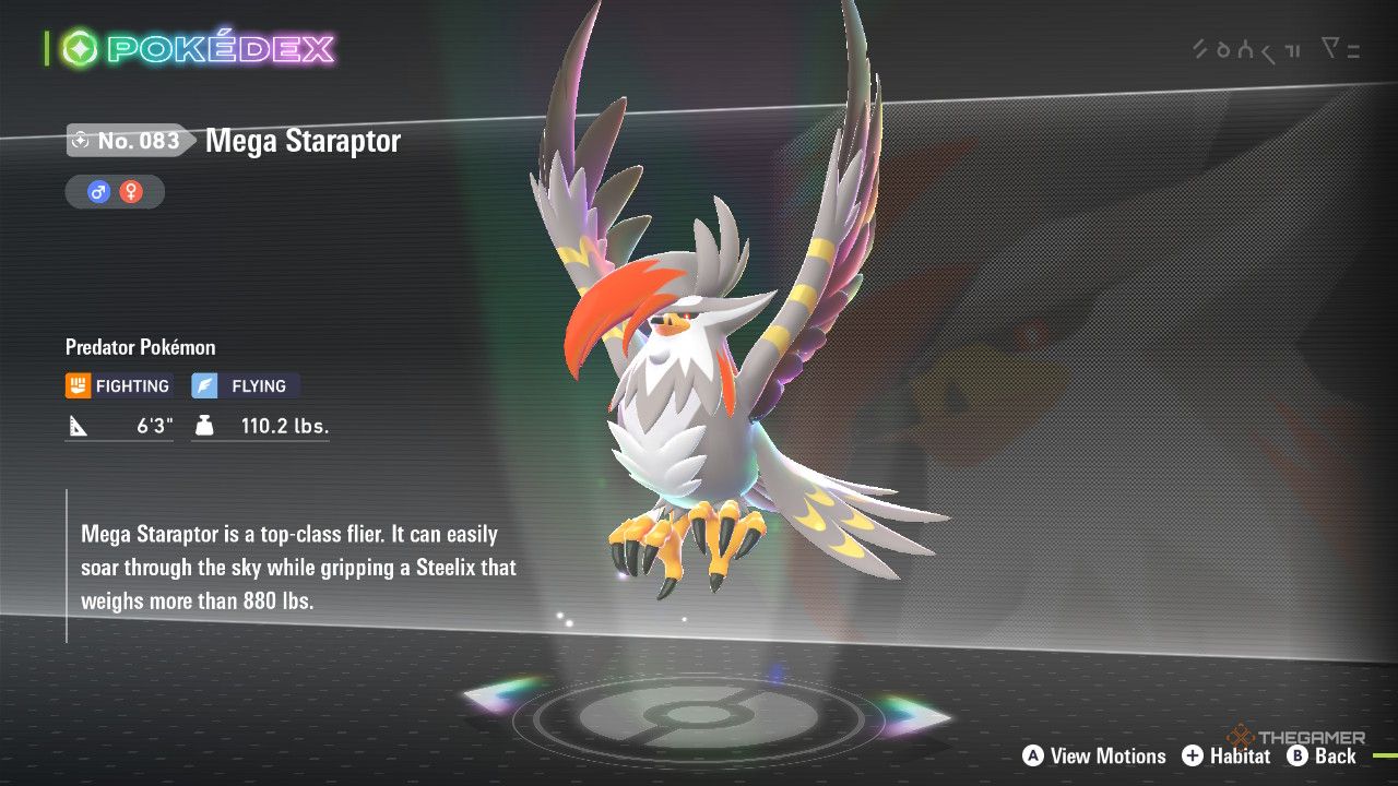 Mega Staraptor получает тип Fighting в дополнение к своему типу Flying, что делает его атаки Close Combat гораздо более мощными. Он также сохраняет хорошую защиту от других Pokemon типа Fighting. Помимо добавленной силы, обновленный дизайн является приятным бонусом. Благодаря своей Mega Evolution, он теперь является сильным претендентом на звание самого улучшенного Pokemon, наряду с Pidgeot.