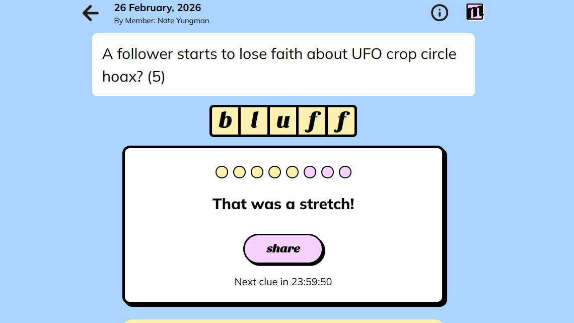Решением сегодняшней головоломки является Bluff. Подсказки: ‘starts to’, ‘about’ и ‘crop’. Одна подсказка говорит нам удалить буквы, другая — выбрать определенные, а последняя указывает, что некоторые буквы следует разместить вокруг других.