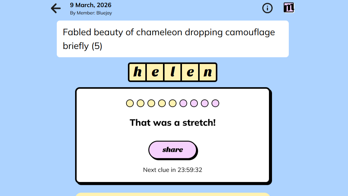 Ответ на сегодня — Хелен. В подсказке использовалось два намека: ‘dropping’ и ‘briefly’. ‘Briefly’ говорит о том, что нужно использовать более короткую версию слова, а ‘dropping’ означает, что вам нужно удалить буквы из слова. Эти намеки не распространены, но они могут помочь вам решить головоломку.