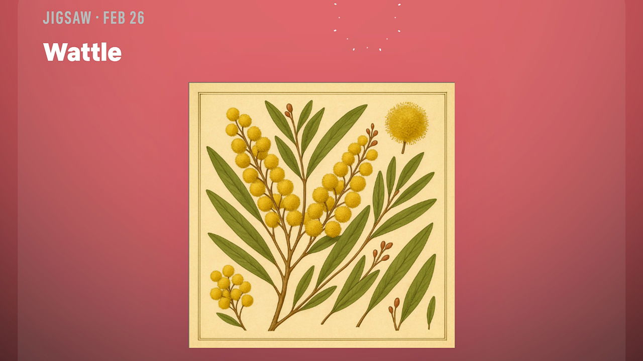 Эта недельная головоломка, названная «Wattle», продолжает нашу ботаническую тему. Вам предстоит собрать красиво иллюстрированную старинную картинку растения золотой акации, с ее узнаваемыми ярко-желтыми пушистыми цветами и зелеными листьями.