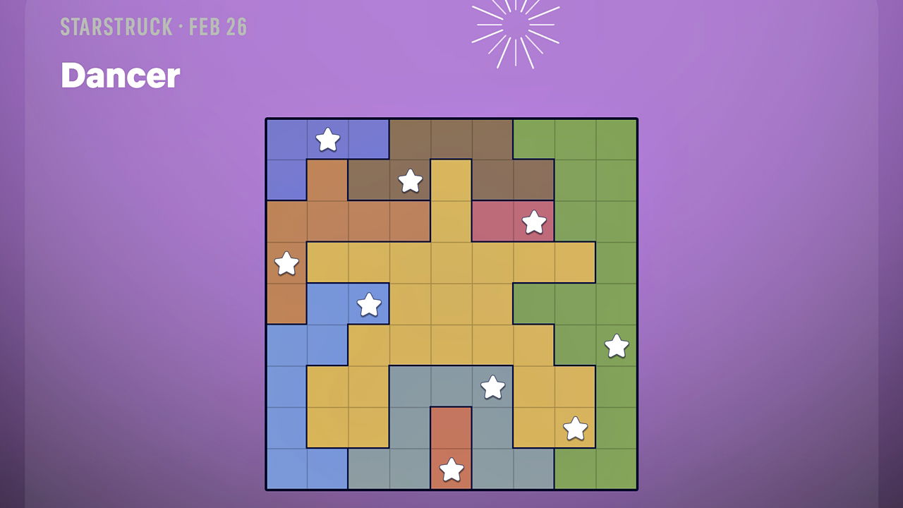 Starstruck предлагает вам расставить звёзды на сетке таким образом, чтобы в каждой строке, столбце и цветной области была ровно одна звезда. Звёзды также не должны касаться друг друга, даже углами. Легкая головоломка сегодня называется «Hit the Road», а сложная — «Dancer». Обе головоломки лучше всего решать внимательно, особенно если вы не уверены в своём следующем шаге.