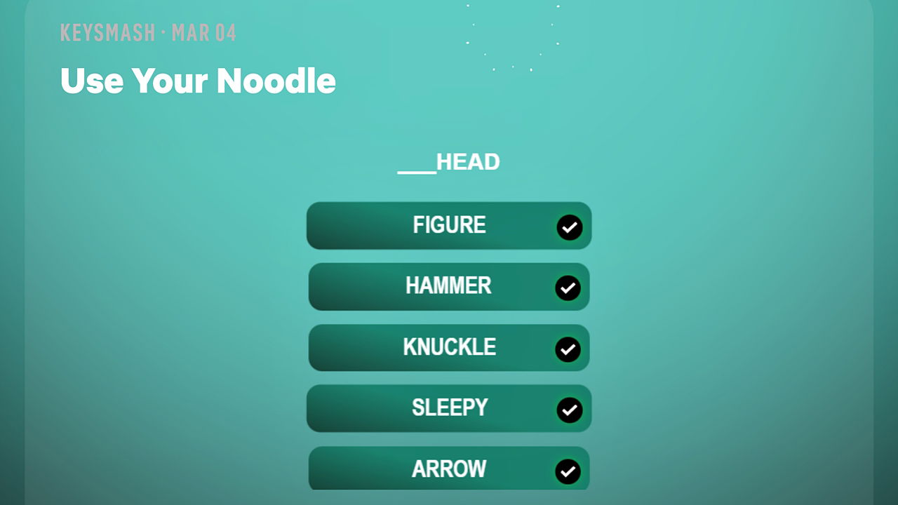 Подсказка к ежедневной головоломке Keysmash, ‘Use Your Noodle,’ предполагает, что ответ будет связан с ‘___HEAD’. Разгадайте недостающие гласные, чтобы решить её!