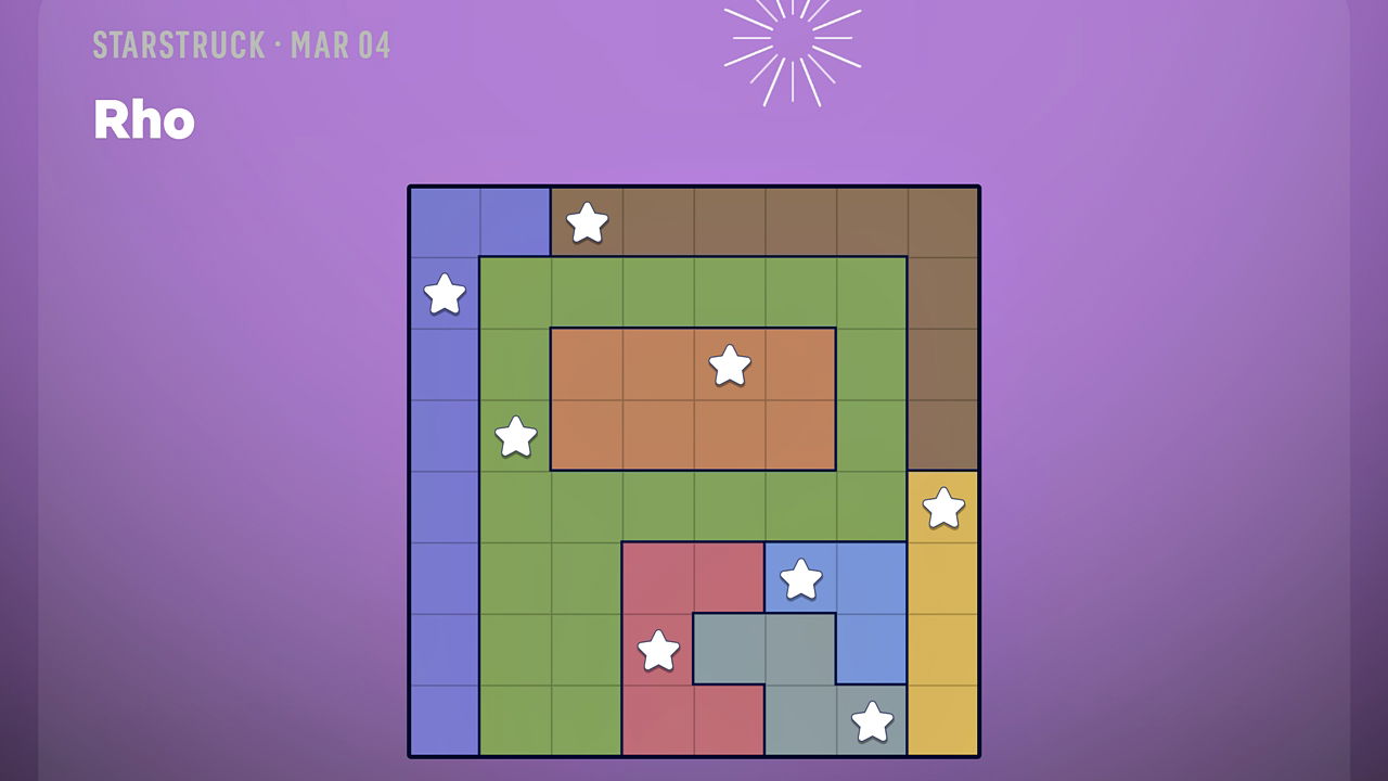 Starstruck предлагает вам заполнить головоломки звёздами, размещая только одну звезду в каждой строке, столбце и цветной области. Звёзды нельзя размещать рядом друг с другом, даже по диагонали. Головоломки, доступные сегодня, называются ‘Rho’ (более простая версия) и ‘Lollipop’ (более сложная версия).