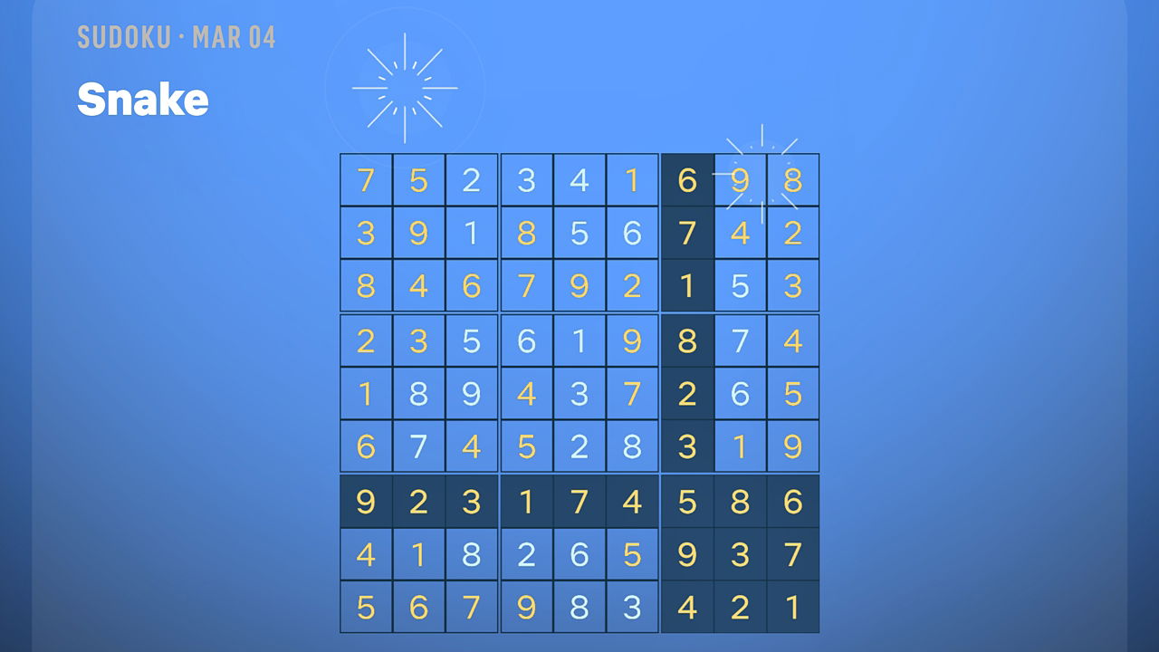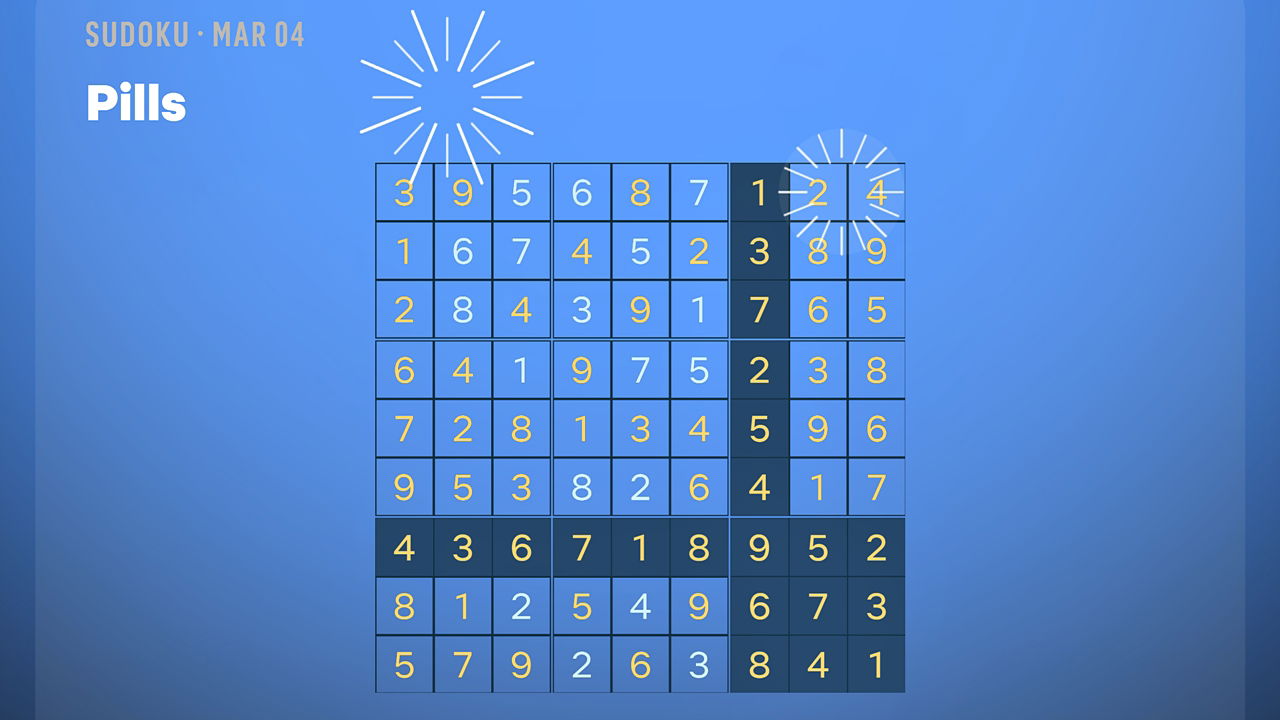 Сегодняшние головоломки – ‘Pills’ (Easy), ‘Percent Sign’ (Medium) и ‘Snake’ (Hard) – все это стандартные сетки Судоку 9×9. Если вы застрянете в строке или блоке, посмотрите решенные головоломки в галерее, чтобы получить подсказки!