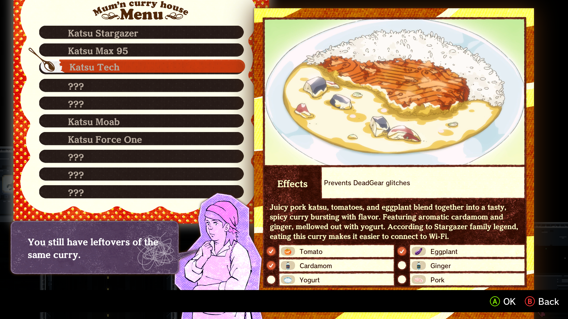 Когда вы выбираете каждый ингредиент для приготовления, появляется краткое описание, рассказывающее о том, откуда он родом и какой у него вкус. В какой-то момент сестра Ромео, Луна, неожиданно начинает рассказывать длинную традиционную японскую историю. Кроме того, один из ваших товарищей по команде, GreenRiver, на самом деле является персонажем Midori Midorikawa из видеоигры No More Heroes 3, а Ромео оказывается втянутым в побочное задание с ней, чтобы определить лучшего футболиста всех времен для викторины.