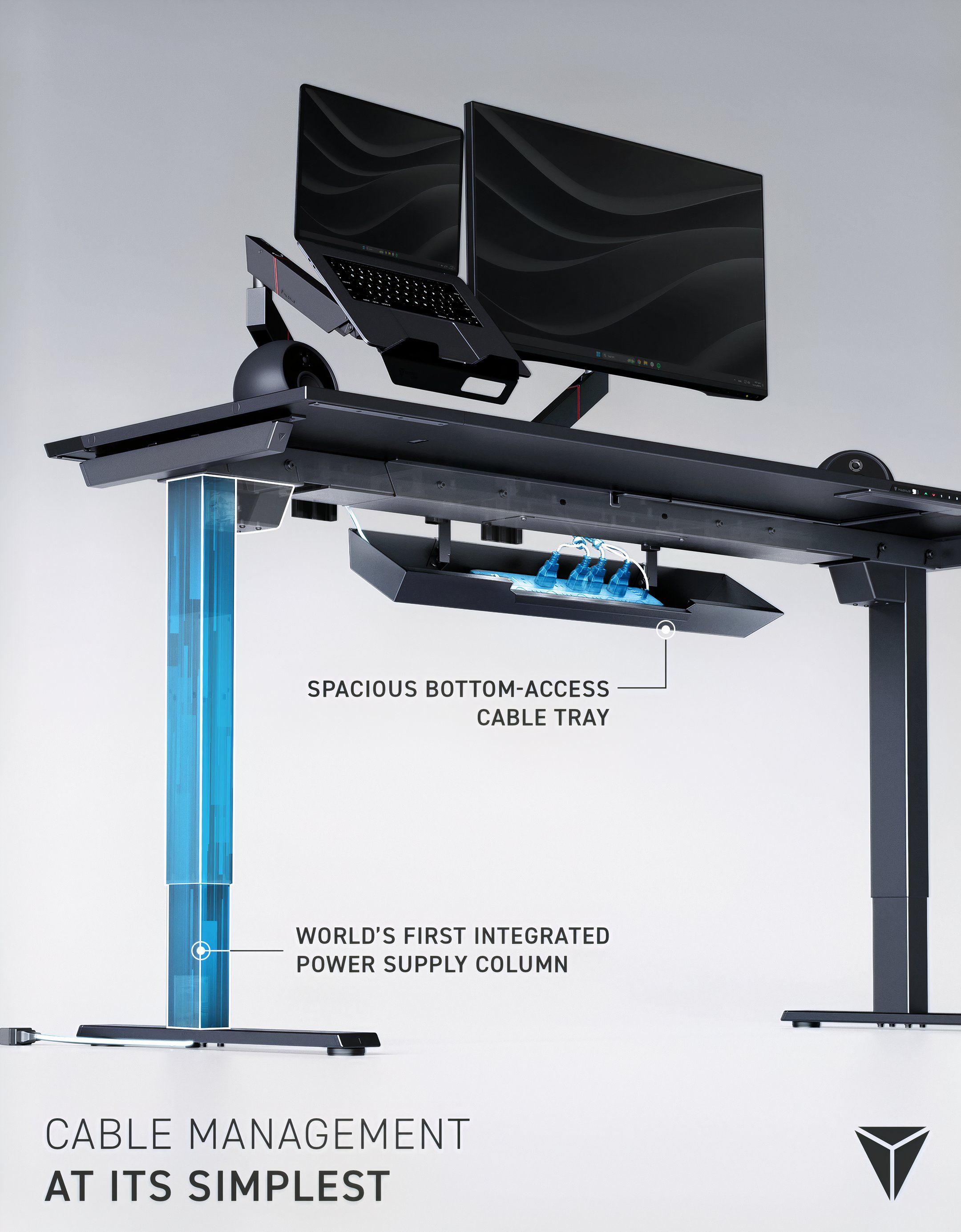 Стол имеет цельный, унифицированный дизайн. От гладкой черной поверхности до скрытых кабелей и прочной, устойчивой к царапинам стальной задней панели, он создает красивый и отполированный вид со всех сторон.