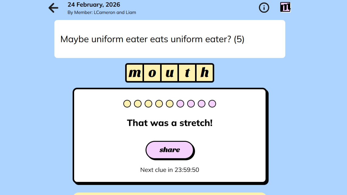 Решением сегодняшней головоломки является Mouth. Подсказка использует слово ‘eats’ (ест), чтобы указать, что один набор букв должен окружать другой. Буквы, которые нужно использовать, можно найти во фразе ‘Maybe uniform eater’ и слове ‘uniform’. По сути, вам нужно объединить их, чтобы получить ответ.