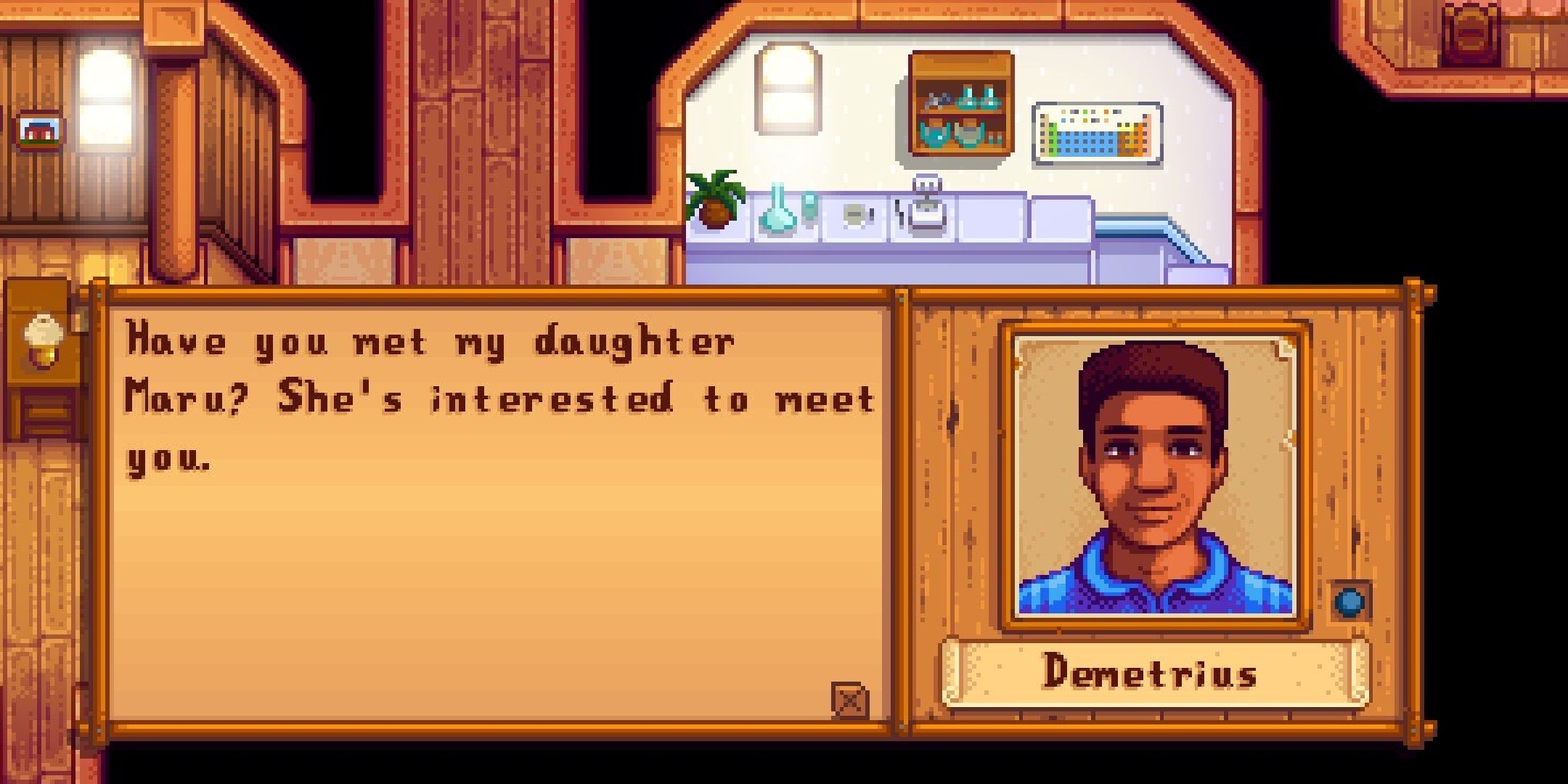 Меня в основном интересует Деметрий, чтобы Робин мог перейти к кому-то, кто ему больше подходит, хотя у Деметрия определенно есть привлекательные качества. Я восхищаюсь его интересом к странному зеленому дождю, и он всегда рад помочь вам продвинуть Общественный центр, отремонтировав пещеру на вашей ферме – чего Клинт никогда бы не сделал.