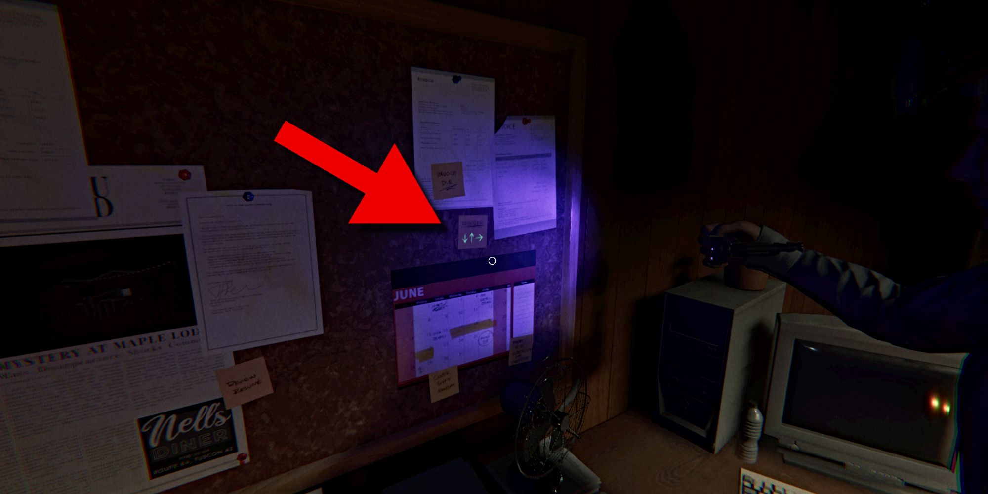 Чтобы начать головоломку, возьмите ультрафиолетовый фонарь из фургона и отправляйтесь в офис Менеджера, который находится в правой задней части закусочной. Внутри офиса осмотрите доску объявлений в правом заднем углу. Включите ультрафиолетовый фонарь и посветите им на маленькую жёлтую липкую записку с надписью ‘Reminder’. Вы увидите последовательность из трех стрелок: вниз, вверх и вправо – в этом порядке.